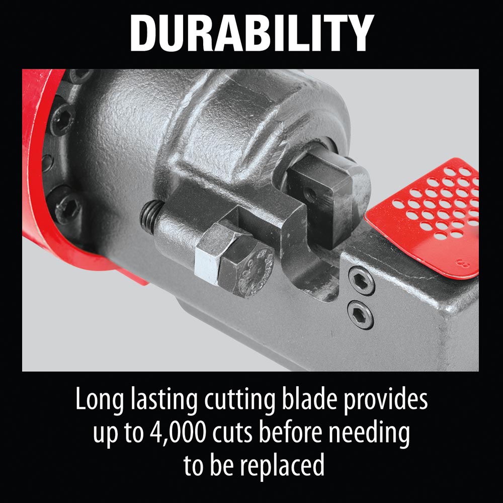 • 4-way rotatable cutting blade makes up to 4,000 cuts of #3 (3/8″) rebar before needing to be replaced