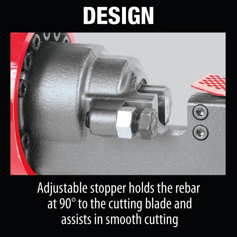 • Adjustable stopper holds the rebar at 90° to the cutting blade and assists in smooth cutting