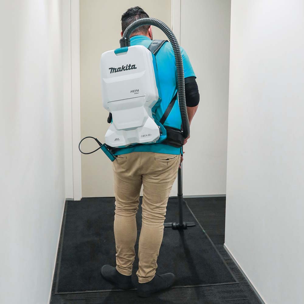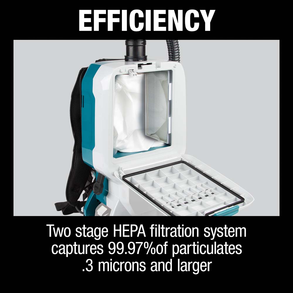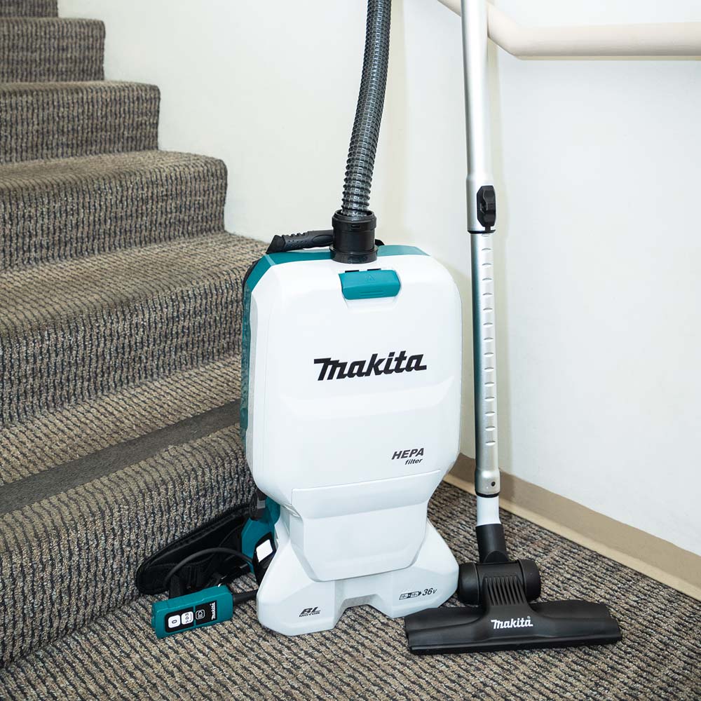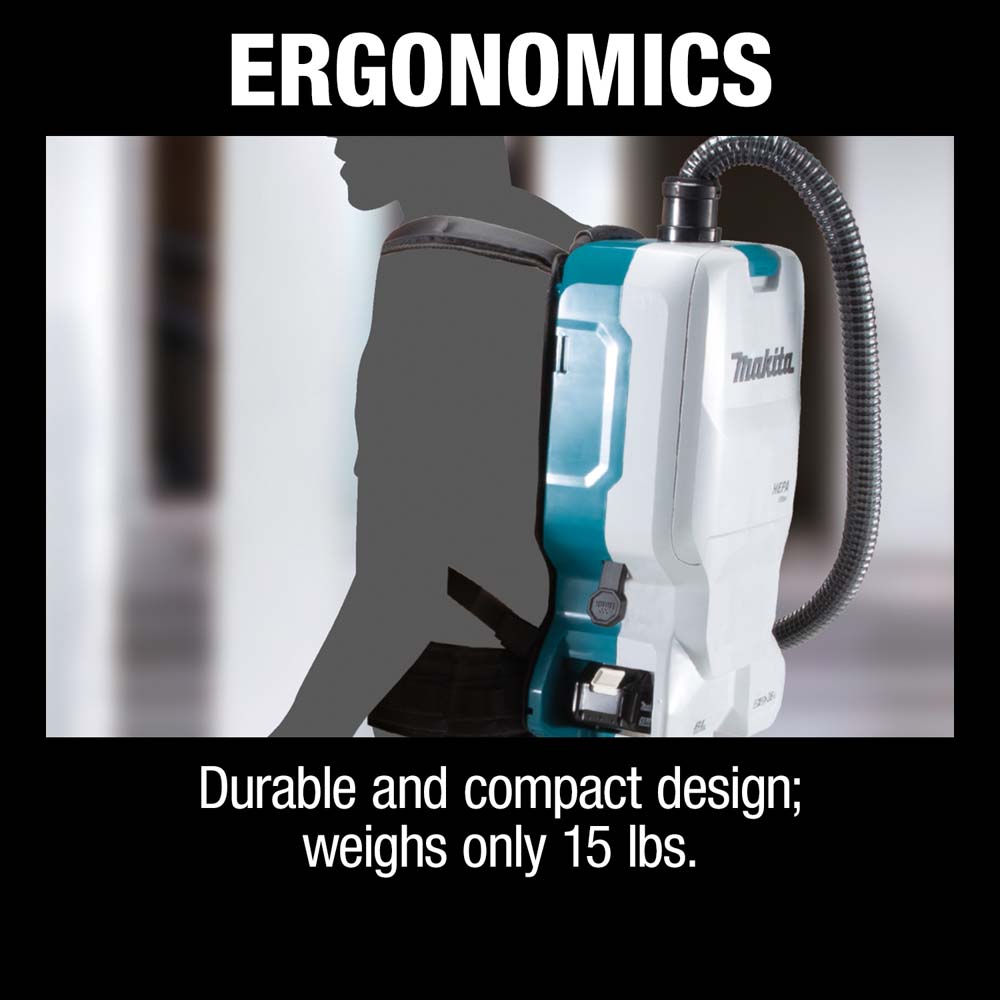 The Makita® 36V (18V X2) LXT® Brushless 1.6 Gallon HEPA Filter Backpack Dry Vacuum Kit (XCV17PG) is a powerful and portable clean-up solution that eliminates extension cords that trail corded backpack vacuums. The XCV17PG is ideal for cleaning crews, as well as for construction applications when used as part of a dust extraction system.