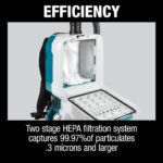The efficient HEPA filter combined with the filter bag captures large, small and micro dust particulates, and the half-gallon dust collection container is easily removed for dust disposal. When using two 18V 5.0Ah batteries, users will get up to 139 minutes of continuous operation on low setting and 40 minutes on the high setting.