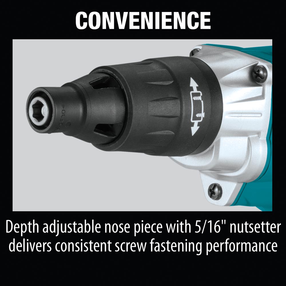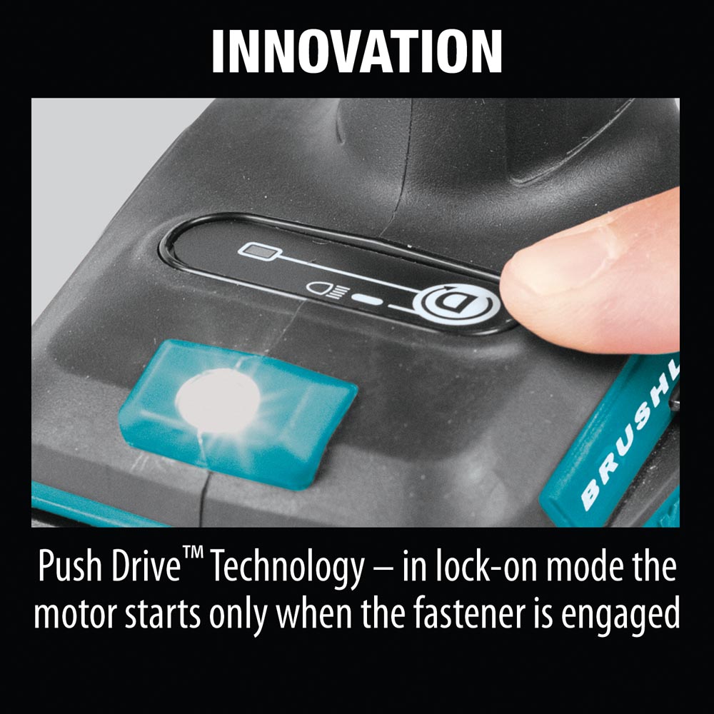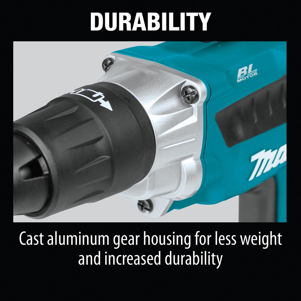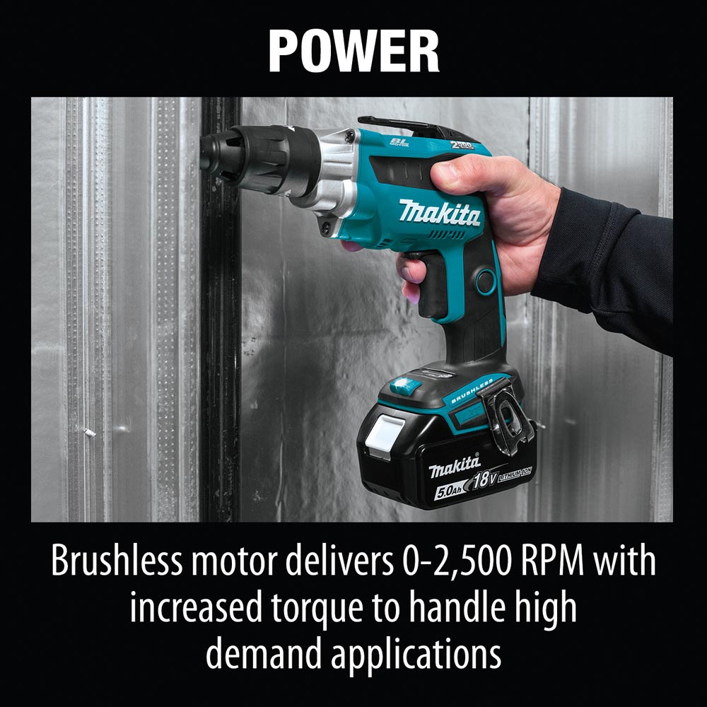 The 18V LXT® Lithium-Ion Cordless 2,500 RPM Screwdriver (model XSF05T) breaks new ground in high demand applications. It’s powered by a Makita brushless motor for longer run time, increased power and speed, and longer tool life. With the exclusive Push Drive™ Technology, the 18V 2,500 RPM Screwdriver can be set on lock-on mode so the motor starts only when the fastener is engaged. This gives contractors a quieter work environment, and also saves on battery power. It’s built for added durability with Extreme Protection Technology (XPT™), which is engineered for improved dust and water resistance for operation in harsh job site conditions. It is ideal for hanging sheetrock, metal framing, installing subfloors, backer board, and decking applications.