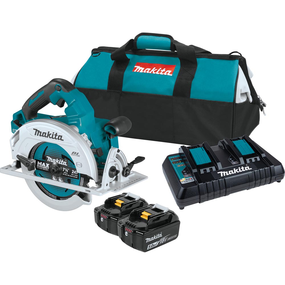 Makita, a pioneer in brushless motor technology and battery innovation, combines both in the 36V (18V X2) LXT Brushless 7-1/4” Circular Saw Kit (XSH06PT). It’s powered by two 18V LXT Lithium-Ion batteries for maximum performance, and has an electronically-controlled BL™ Brushless motor that matches torque and RPM to the application. Makita 18V X2 means freedom from the cord, even for demanding applications like cutting sheet and dimensional lumber that traditionally called for a corded saw. Best of all, users can remain in one battery platform, using the same fast-charging 18V batteries with the XSH06PT as they use across the expansive Makita 18V LXT® cordless tool system.