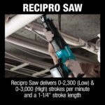 • Recipro Saw delivers 0-2,300 (Low) & 0-3,000 (High) strokes per minute and a 1-1/4″ stroke length for faster cutting; weighs only 8.2 lbs. with battery