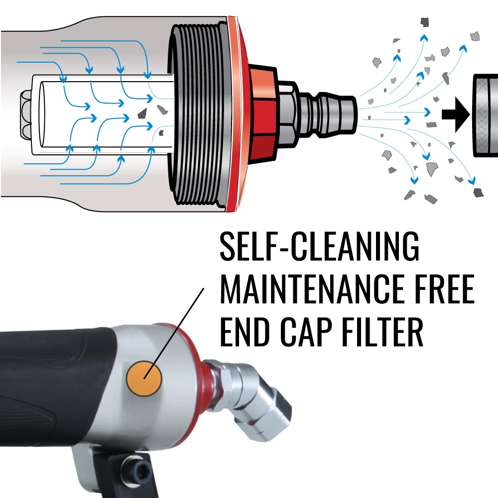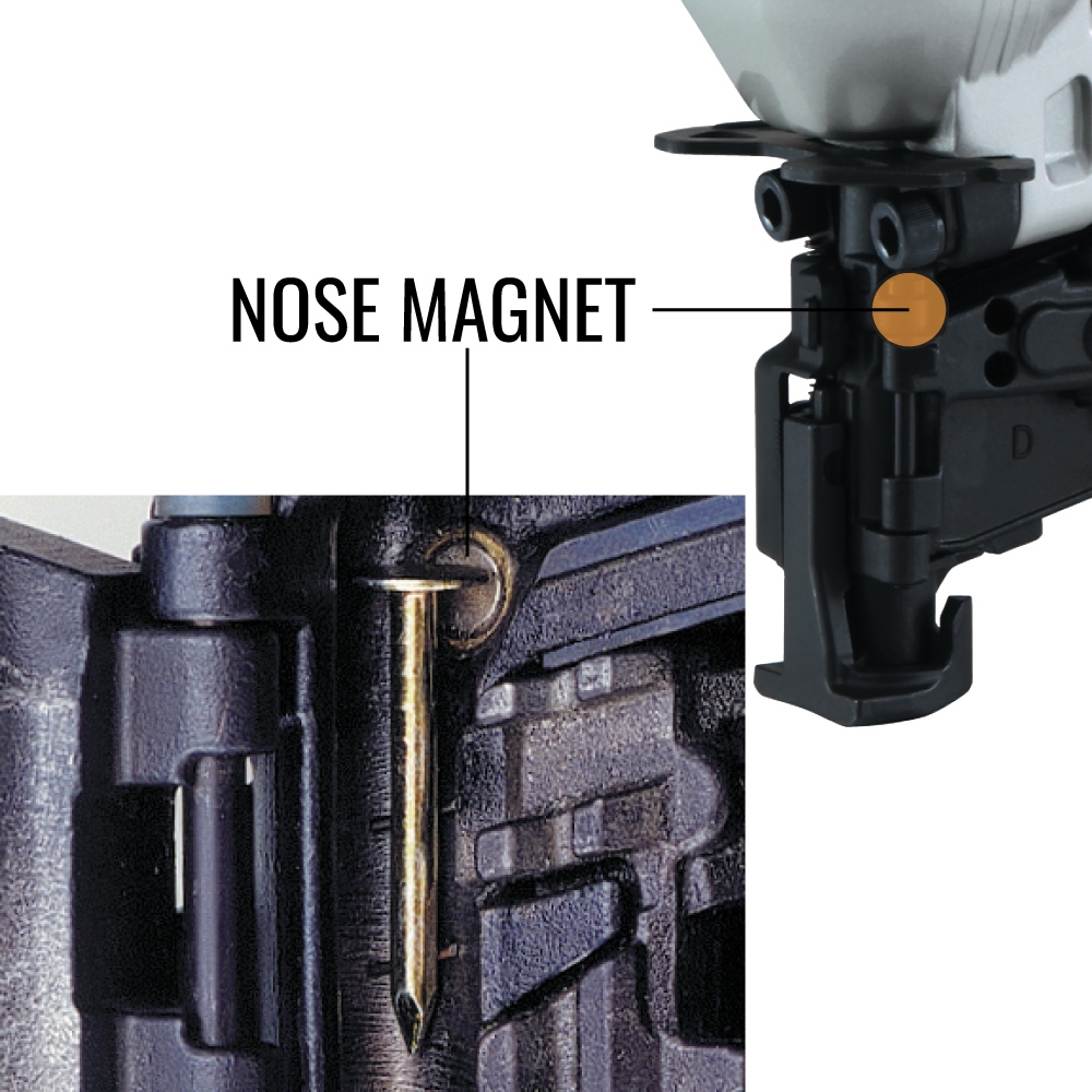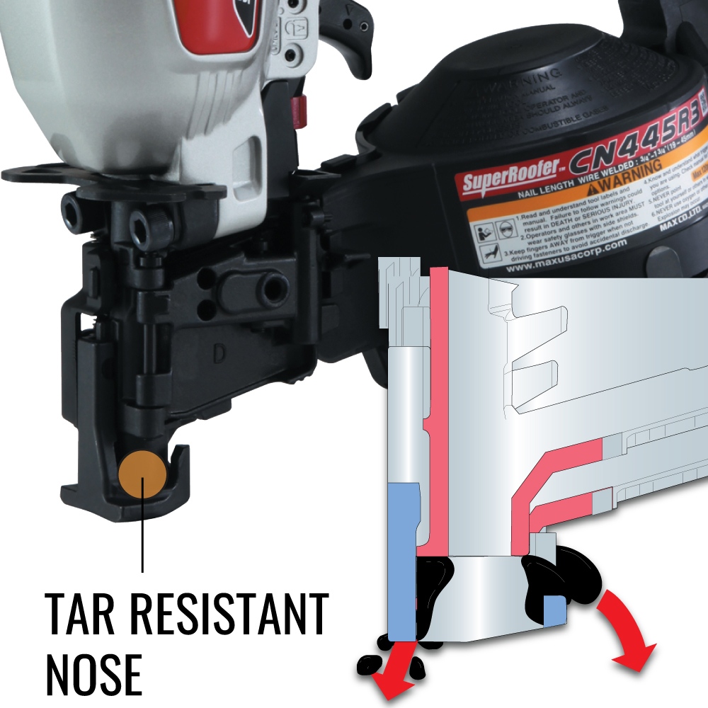A self cleaning maintenance free end cap filter is also standard on the MAX CN445R3 roofing nailer. As a result, dust and debris is forced back out of the tool when the hose is disconnected. This prolongs the life of the tool and reduces maintenance and cleaning. A convenient nose magnet holds on to the last nail preventing waste. In addition this roofing nailer has a tar resistant nose. As a result, you can go up to 8 times longer between cleanings over other brands. The contact foot is also removable.