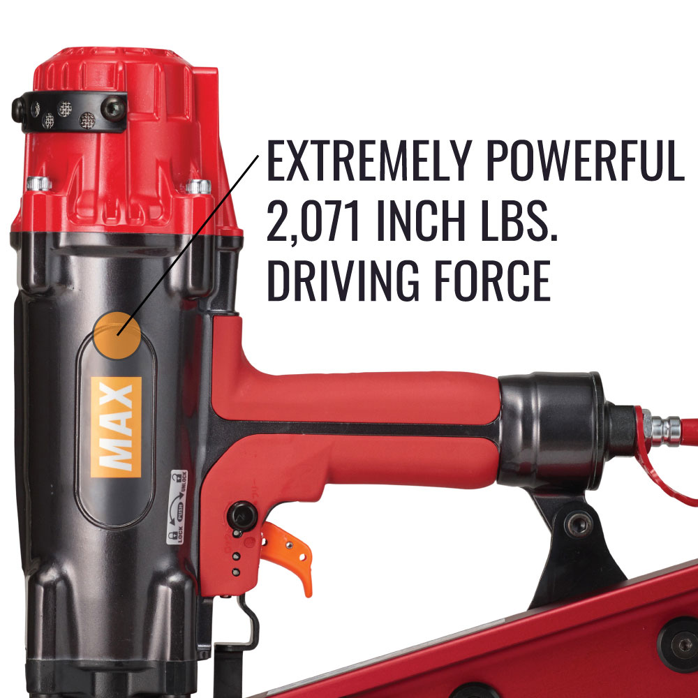 The HS130 from the safety equipped PowerLite platform is an extremely powerful 21 degree framing full round head stick nailer that is also lightweight and slim for its size (9.5lbs compared to conventional tools). The well-balanced nailer makes one handed operation comfortable with the ability to drive up to 5-1/8” nails at a robust 500 PSI strength, while delivering a low recoil on each shot. Several safety mechanisms have been built into this powerful tool such as a trigger lock to avoid accidental firing, whereas an incorporated nose magnet helps to avoid jamming by holding the last nail in place for safe loading and unloading operations. MAX is committed to manufacturing reliable tools that have been designed to deliver enhanced performance while making sure that users can carry out safe operations.