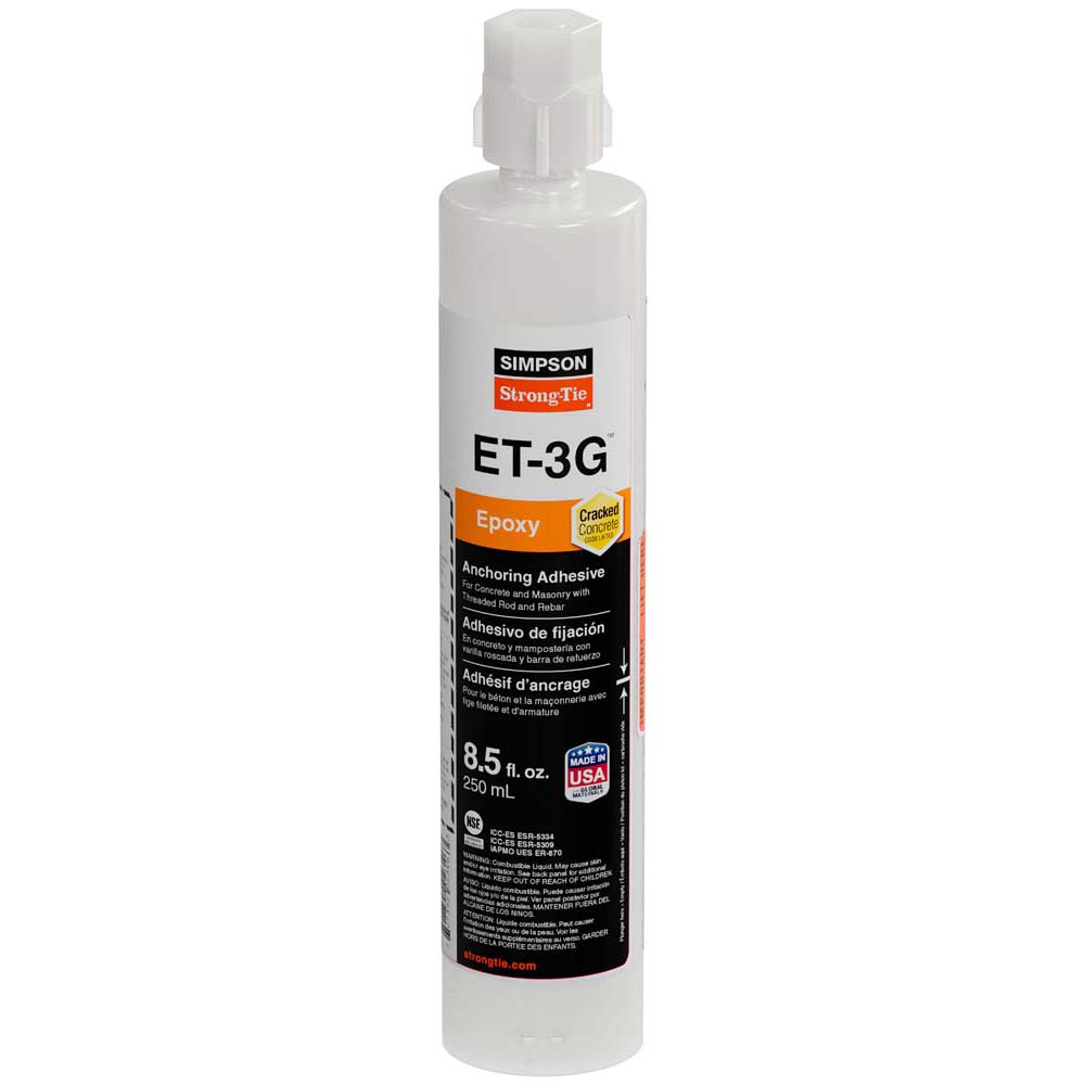 The Simpson Strong-Tie ET3G10 is a high-strength, two-component epoxy adhesive designed for anchoring threaded rod and rebar in cracked and uncracked concrete and masonry. Engineered for superior bond strength, this epoxy performs exceptionally well in both static and seismic loading conditions, making it an ideal choice for structural applications and infrastructure projects. With its high-solids formula, ET-3G ensures strong, durable anchoring in a wide range of conditions, including horizontal, vertical, and overhead applications. It is also available in bulk quantities for high-volume jobs, providing versatility for contractors and engineers requiring a reliable, high-performance adhesive. The 8.5-ounce cartridge comes with a nozzle and extension for precise and easy dispensing, and with a two-year shelf life, it offers excellent jobsite flexibility. Additionally, ET-3G is DOT-approved for various infrastructure applications.