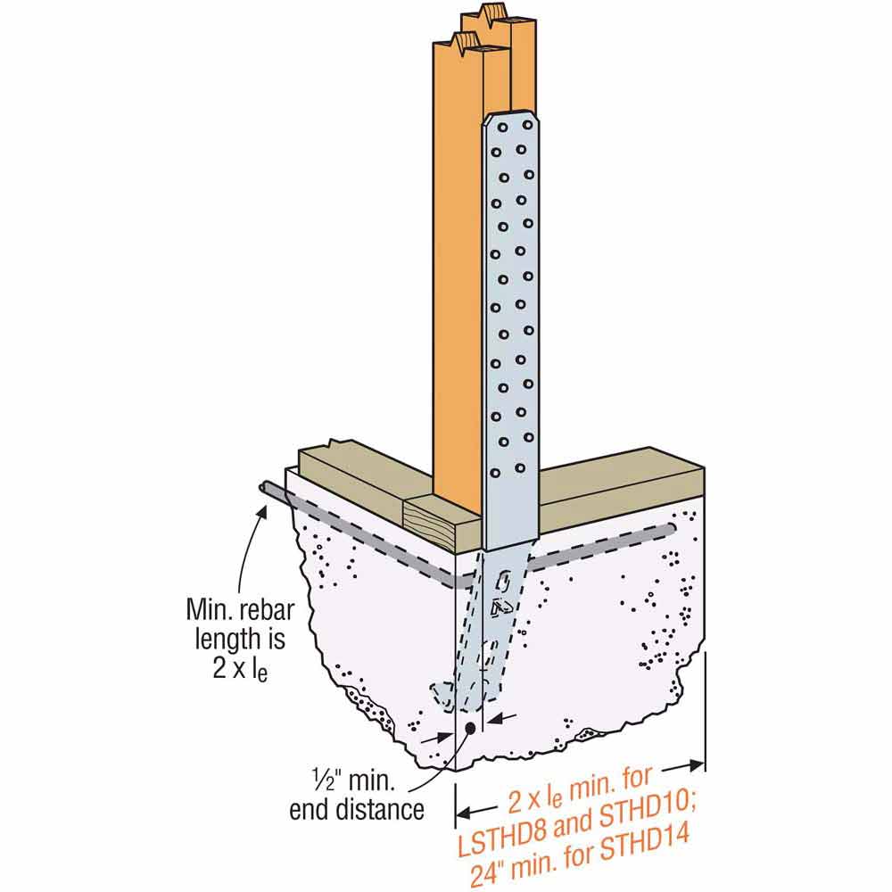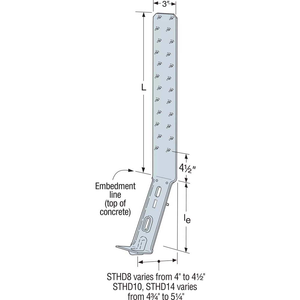 The Simpson Strong-Tie STHD14 is a heavy-duty, embedded strap-tie holdown engineered to deliver high load capacity in both wood and cold-formed steel construction. With a design that optimizes performance and minimizes concrete spalling, the STHD14 is ideal for seismic and wind-load applications where reliable anchorage is essential. When paired with the StrapMate strap holder, this holdown offers increased pre-pour stability, reducing unwanted movement during concrete placement. Its staggered nail pattern helps prevent wood splitting, while the countersunk nail slots allow for a flush finish. Slots below the embedment line provide greater concrete bonding and reduce the likelihood of spalling, ensuring a strong and secure connection.