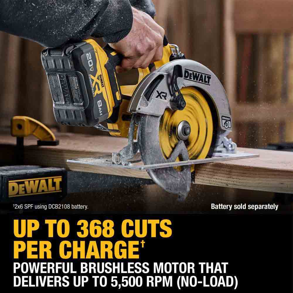 Cut through tough applications with our most powerful 20V MAX* circular saw . Featuring a powerful brushless motor that delivers up to 1,700 MWO and up to 368 cuts per charge**, the 20V MAX* XR 7-1/4 in. Circular Saw is designed to make accurate cuts quickly. With a blade oriented to the right of the motor and a top handle position design, this circular saw is built for ease-of-use on challenging jobsites. This saw comes equipped with an electronic brake that helps stop the blade when the trigger is released. This durable, high-performance circular saw provides smooth, accurate cuts and a bevel capacity of 57° with stops at 45° and 22.5°. Battery and charger sold separately.