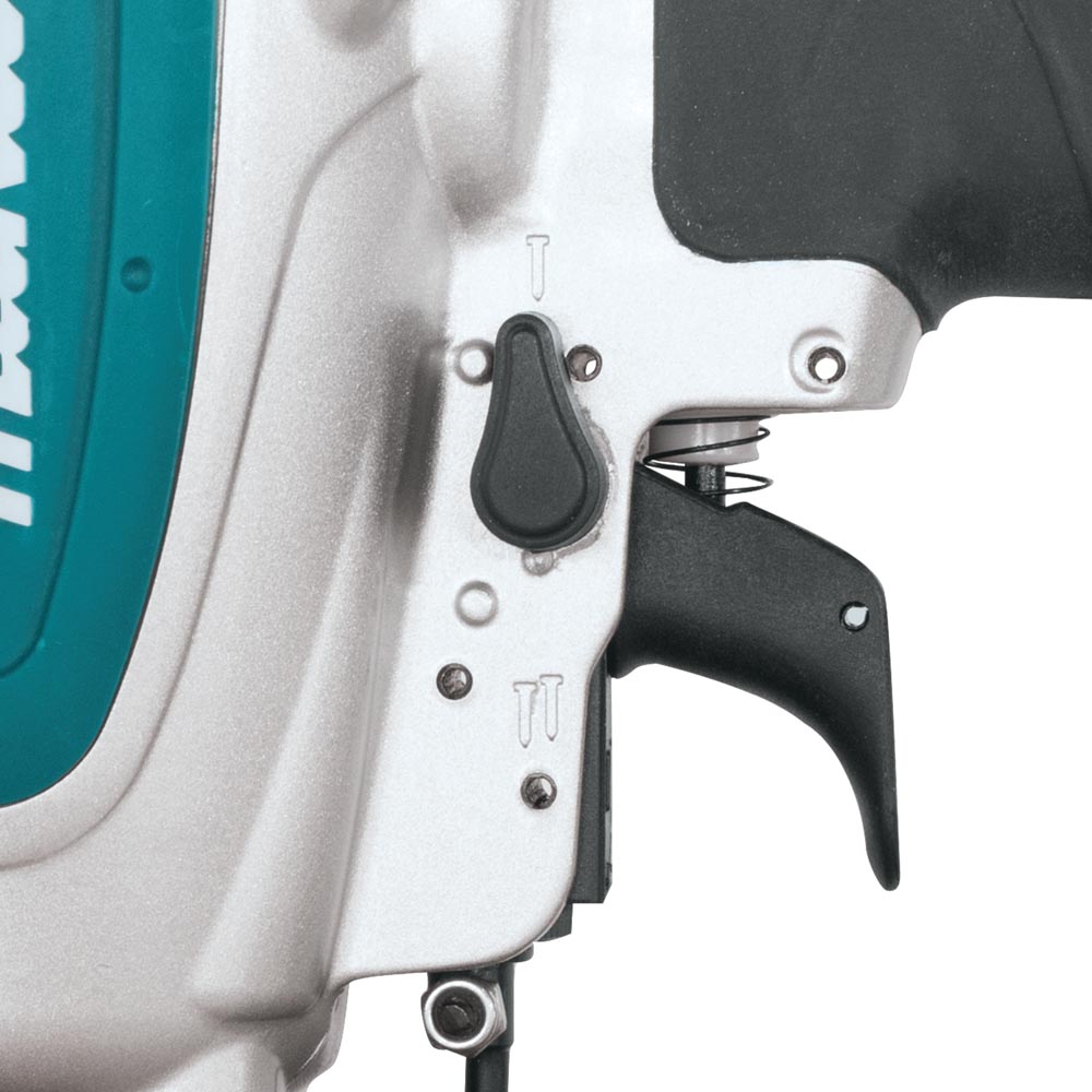 The Makita 16 Gauge Straight Finish Nailer (model AF601) combines a myriad of features and powerful performance in a compact size. The AF601 has a rear-loading magazine that accepts standard 16 ga. straight finish nails sized 1″ to 2-1/2″. The nail lock-out and large windows alert the user when to reload nails as the contact arm and trigger are used together for controlled firing. With a compact size and weighing in at only 3.8 lbs., the AF601 was engineered for all-day professional use. Additional convenience features include a reversible belt hook that allows the tool to remain close-by, a multi-directional exhaust port that directs exhaust air away from the user, a built-in air duster that provides convenient air flow to clear your workspace, and a 2-mode selector switch offering quick control over nailing operation.