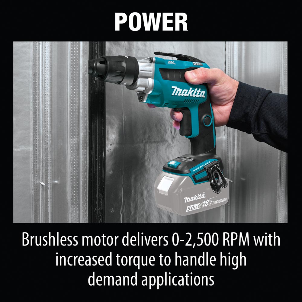 The 18V LXT® Lithium-Ion Cordless 2,500 RPM Screwdriver (model XSF05Z, tool only, batteries and charger sold separately) breaks new ground in high demand applications. It’s powered by a Makita brushless motor for longer run time, increased power and speed, and longer tool life. With the exclusive Push Drive™ Technology, the 18V 2,500 RPM Screwdriver can be set on lock-on mode so the motor starts only when the fastener is engaged. This gives contractors a quieter work environment, and also saves on battery power. It’s built for added durability with Extreme Protection Technology (XPT™), which is engineered for improved dust and water resistance for operation in harsh job site conditions. It is ideal for hanging sheetrock, metal framing, installing subfloors, backer board, and decking applications.