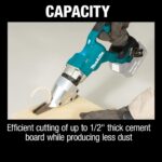 - Efficient cutting of up to 1/2″ thick cement board while producing less dust