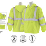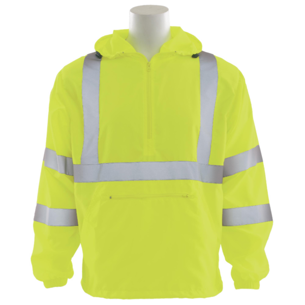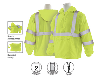 High visibility lime windbreaker meets ANSI 107 Type R, Class 3 and will be noticed on the jobsite. Pullover Hoodie Windbreaker is made from 100% polyester pongee that provides wind resistance and slight water repellency. Pullover hoodie windbreaker has zippered front pouch and large pass-through pocket and is stowable in self-pouch with carrying strap. 2 in. AwareLite reflective trim. Meets ANSI/ISEA 107.