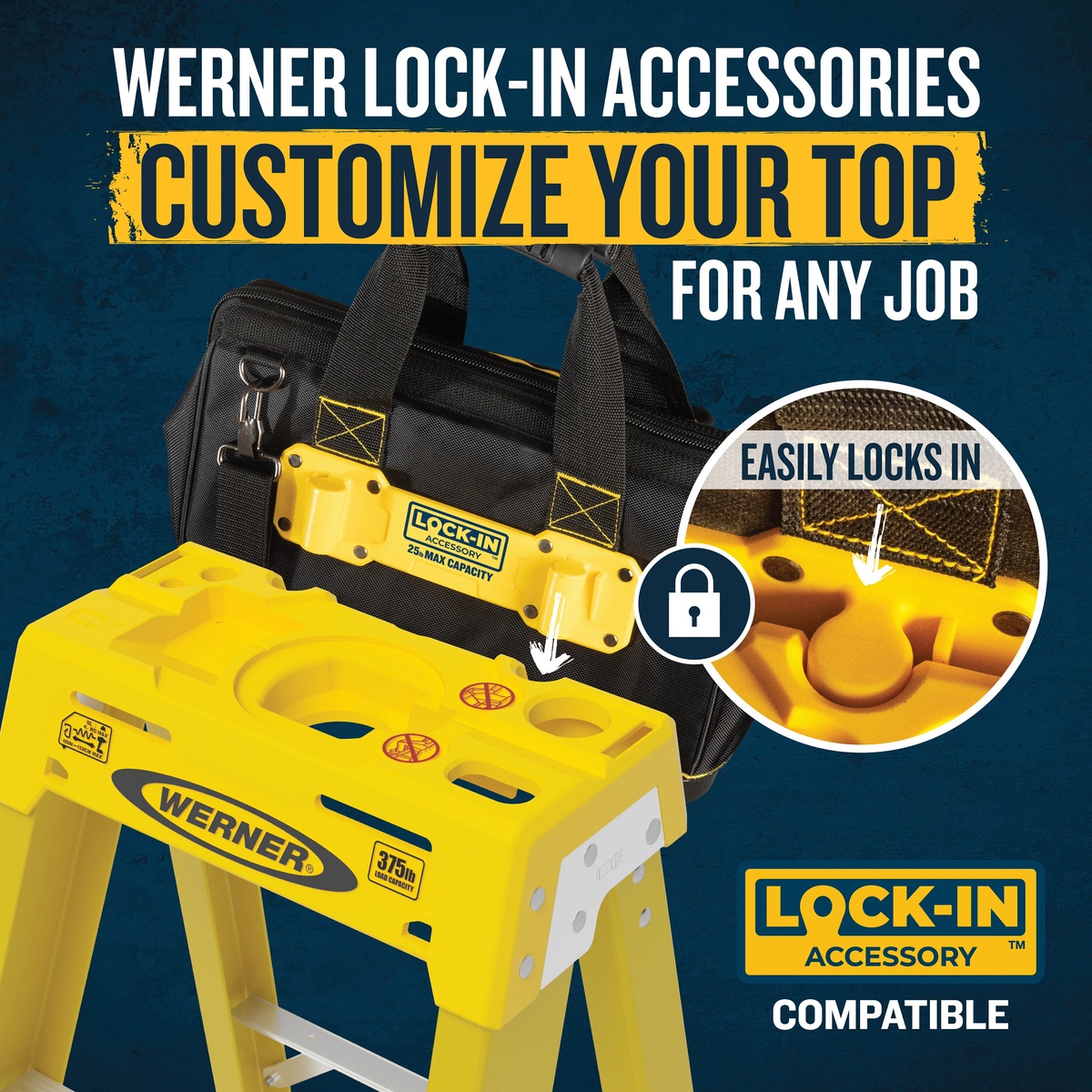 The 6310 is built for pros with a 375 lb duty rating. Its LOCKTOP top integrates the Lock-In accessory system and includes an impact driver slot, steel mounting plate for magnetic accessories, and three anchor points to tether tools. Non-conductive fiberglass rails make it suitable for use around electricity. Steps are fully braced and rear horizontals add stability, while EDGE bracing protects rails and a widened base improves tip resistance. Ideal for jobsite productivity and safety.