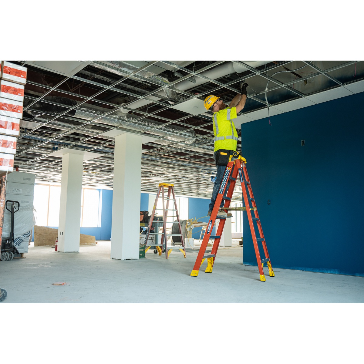 The Werner 76-2 Molded Plastic Pail Shelf is a durable step ladder accessory designed to keep paint and supplies secure while you work. It features spill-proof construction, includes mounting hardware and instructions, is easy to keep clean, and automatically closes with the stepladder. A built-in rag rack adds convenience on the job.