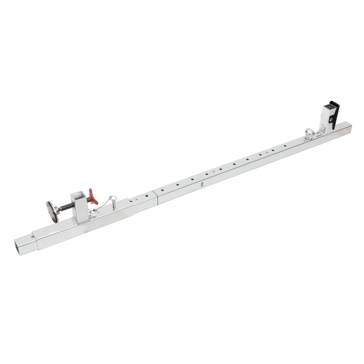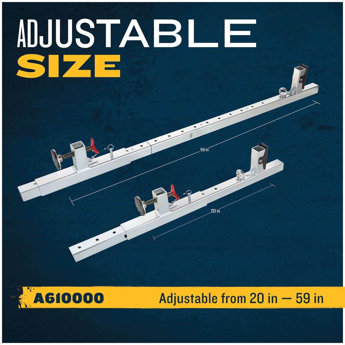 The A610000 securely attaches to door or window frames ranging from 20 to 59 inches without tools or marring. Built from durable aluminum with protected anchor pads and a telescoping design, it provides a rotating connection point for versatile fall protection anchorage and meets ANSI Z359.18 and OSHA 1910.140/1926.502 requirements. Approximate shipping size: 46.5 in L x 5.5 in W x 9.5 in H.