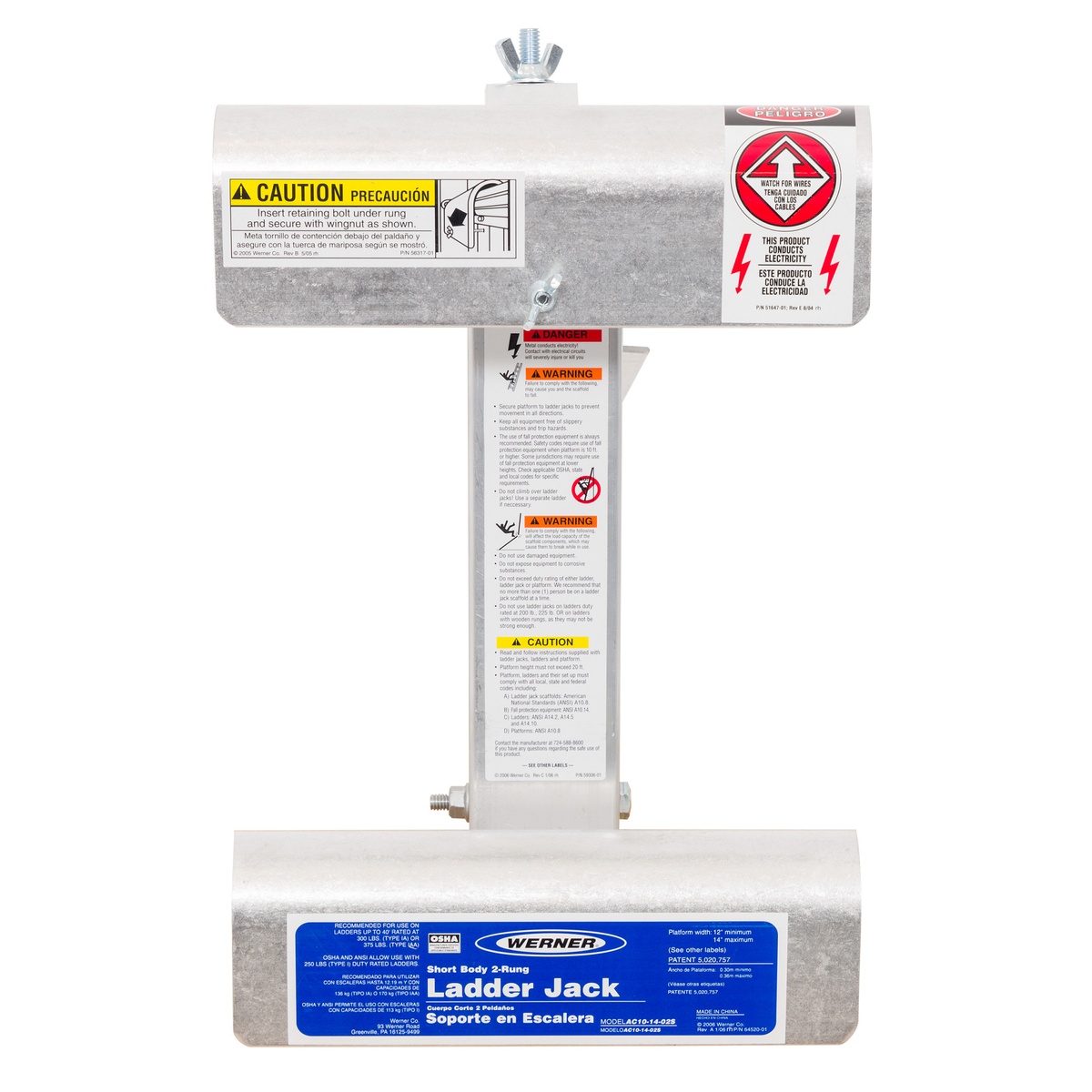 The Werner AC10-14-02S Single Rung Short Body Ladder Jack mounts to either side of an extension ladder and allows quick field adjustments. Its Platform Clamp System secures the platform to the jacks and ties supporting ladders together to help secure the entire system. Accepts stages up to 14 inches wide and is recommended for use with 300 lb Type IA and 375 lb Type IAA extension ladders; OSHA and ANSI allow use with 250 lb Type I ladders. Aluminum construction keeps weight low while maintaining durability.