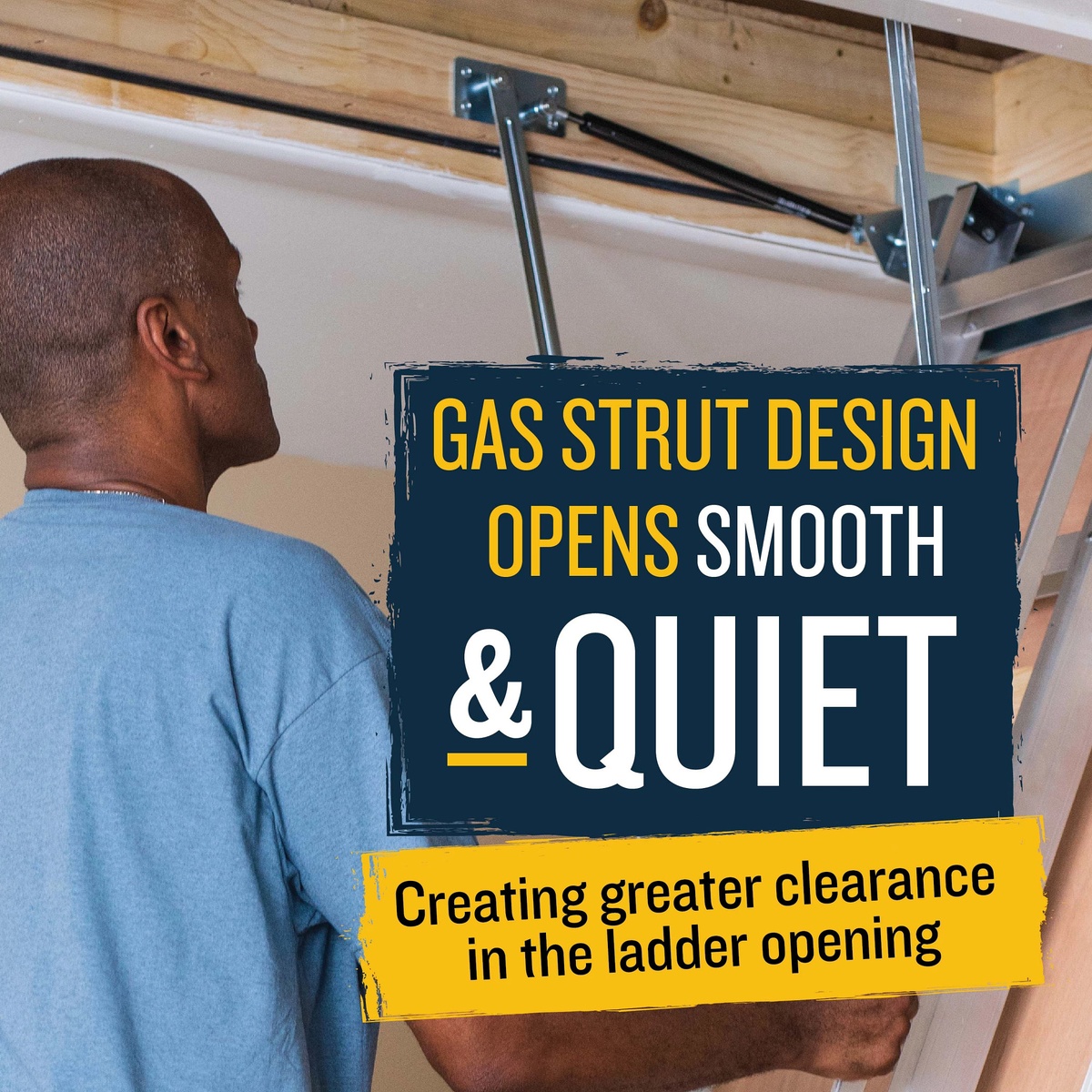 The AH2510C universal aluminum attic ladder is lightweight yet rated to 375 lb (Type IAA). Gas struts eliminate traditional springs, creating a wide access opening and smooth open/close action. Steps are extra wide and slip resistant with non-marring feet. Opening size: 25 in x 54 in; fits ceiling heights 8 ft to 10 ft.