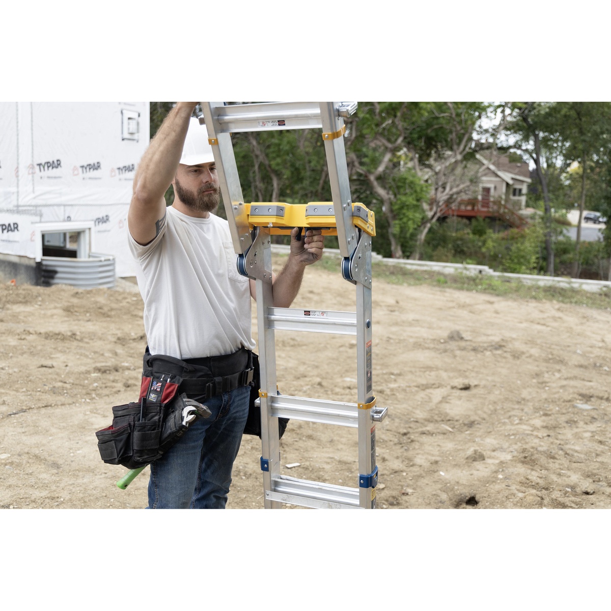 - 6-in-1 versatility: safe leaning, twin step, stairway, 90? wall, extension ladder, or two scaffold bases