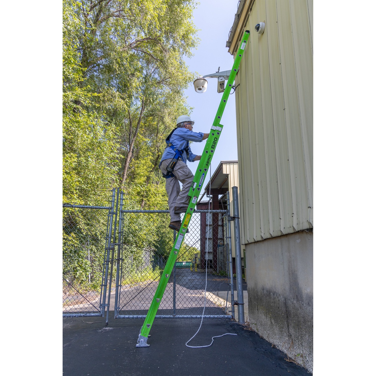 The AERO B7116-2 delivers a 375 lb Type IAA duty rating in a lighter, more rigid design. Its BOXLOK interlocking fiberglass box-rail system provides a solid feel with reduced bounce, twist, and side sway compared to other lightweight ladders. Non-conductive Safety-Green rails, slip-resistant Traction?Tred tri-rungs, rugged rung locks, and dual?action feet help improve productivity and safety when working around electricity or on varied surfaces. Ideal for utility and telecom work where portability and stability matter.