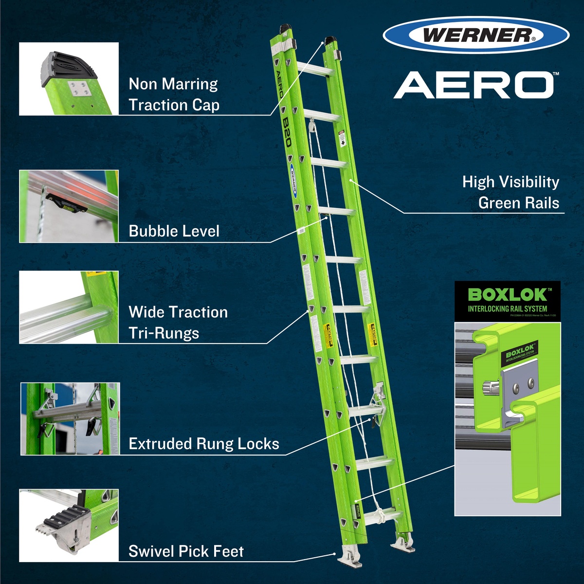 Werner B7116-2 16ft AERO Type IAA Fiberglass Box Rail/Tri-Rung Extension Ladder, Safety-Green