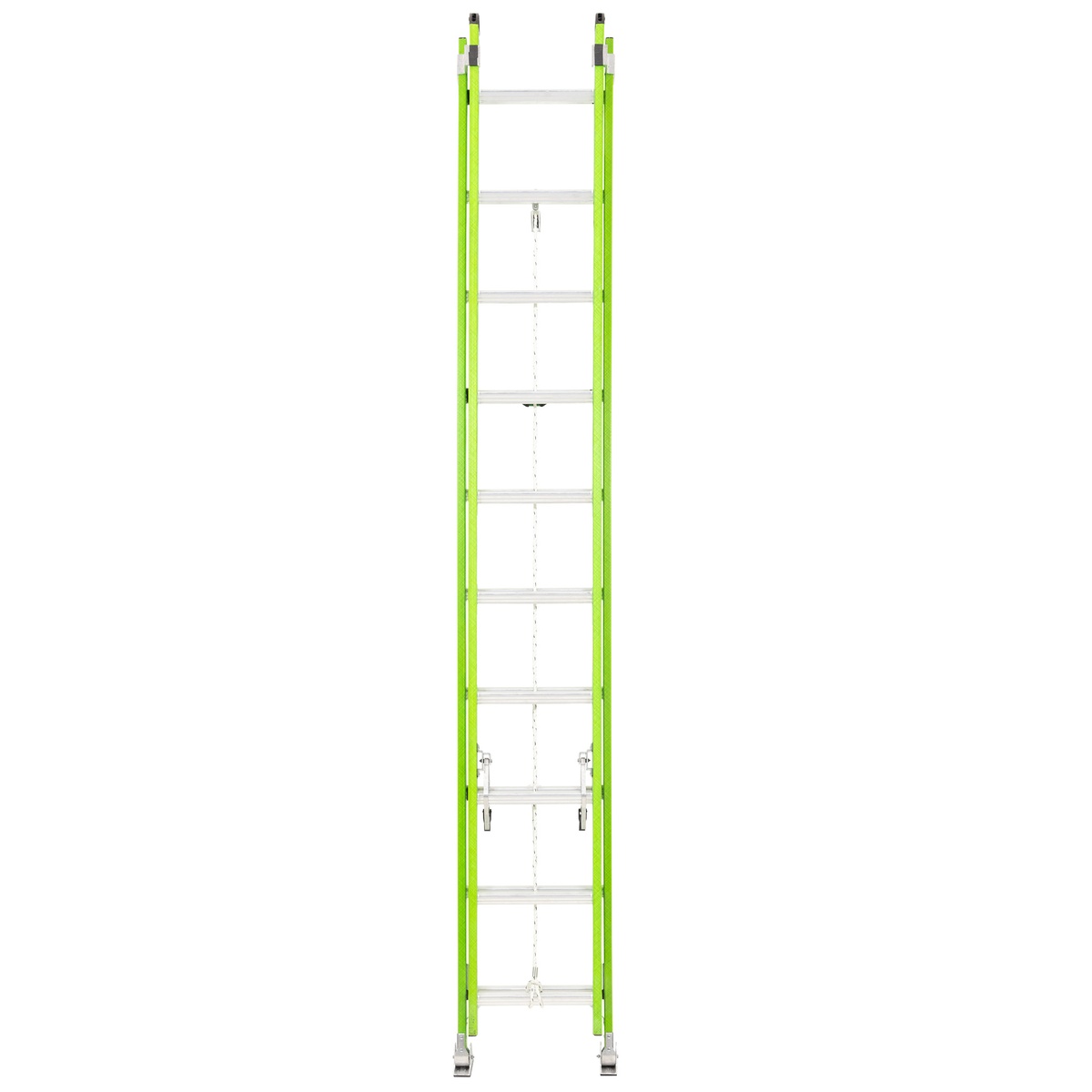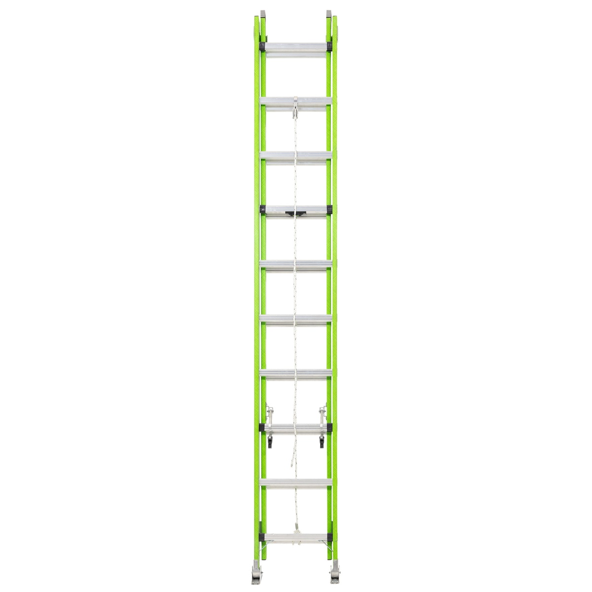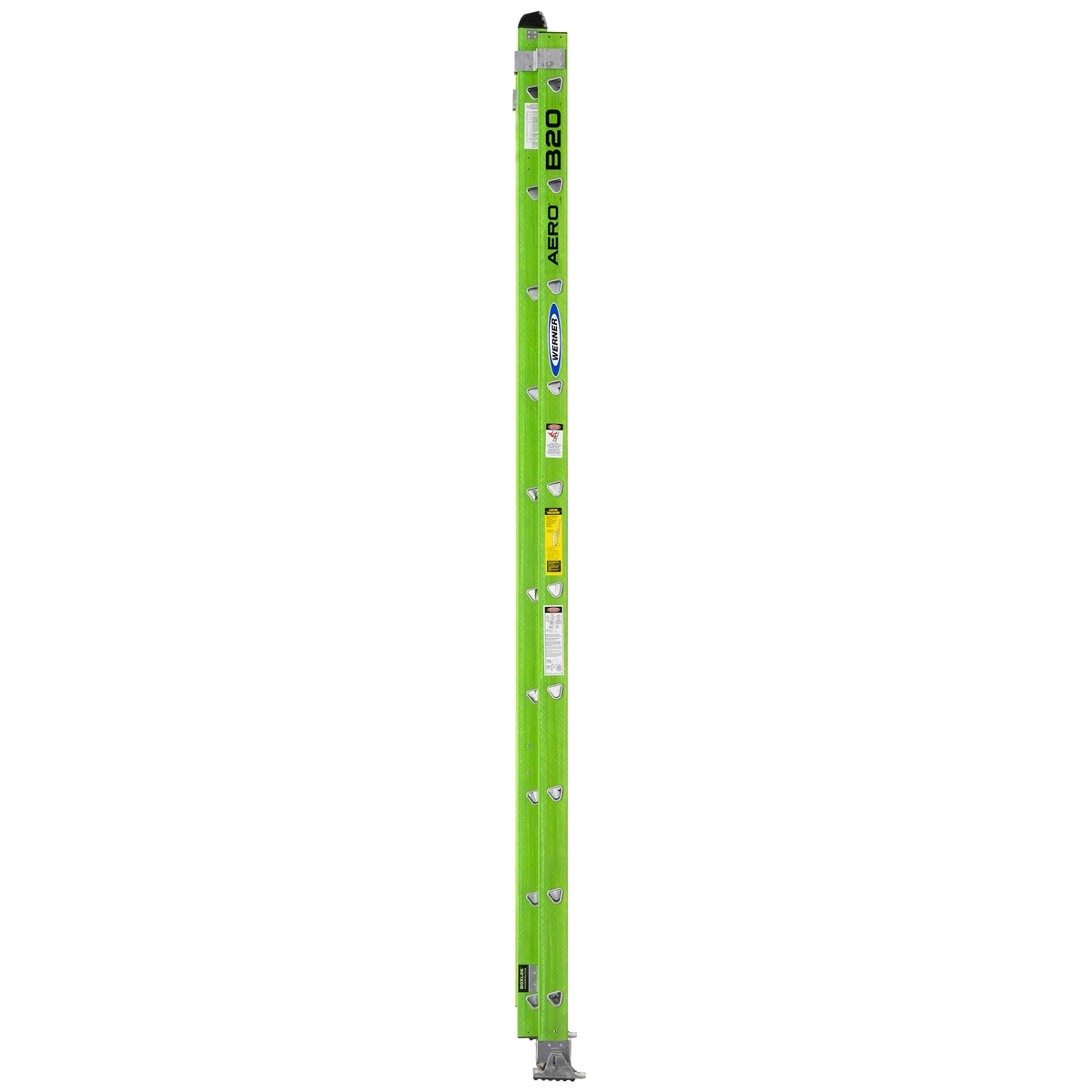 The Werner AERO B7120-2 is a 20 ft lightweight fiberglass extension ladder with a Type IAA 375 lb duty rating. Its patented BOXLOK interlocking box rail design delivers a solid climbing feel with reduced bounce, twist and side sway while remaining 25% lighter than Werner?s standard 375 lb ladders. Tri-rung, slip-resistant Traction?Tred rungs provide a wide, flat standing surface. Ideal for utility and telecom work, the vibrant safety?green fiberglass rails are non?conductive for use near electricity.