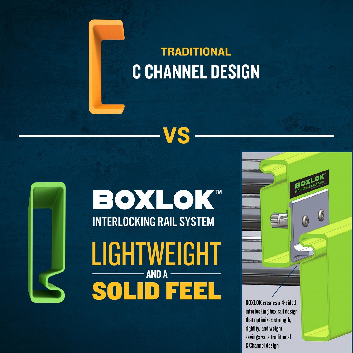 - BOXLOK Interlocking Rail System reduces bounce, twist and sway