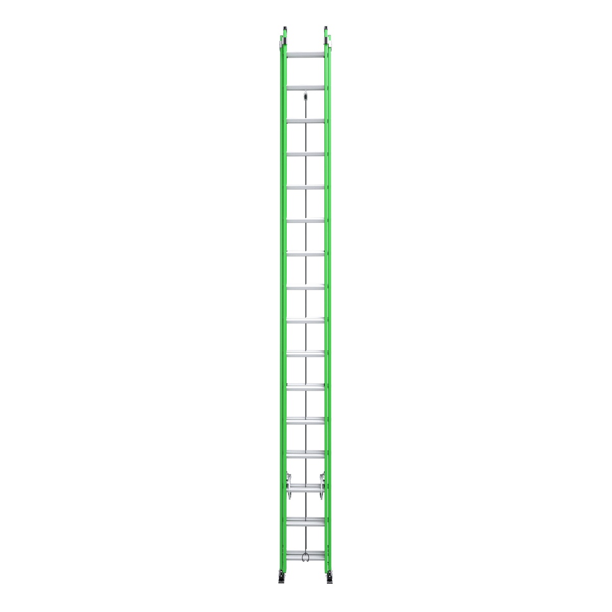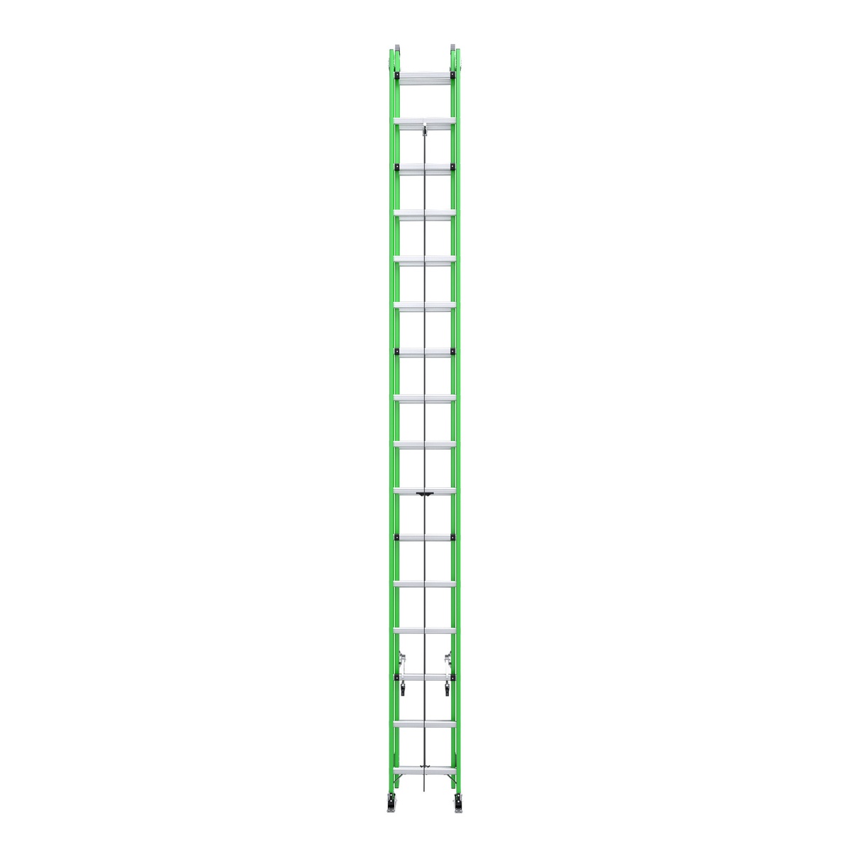 The AERO lightweight fiberglass extension ladder delivers a 375 lb duty rating in a lighter, more rigid design. Werner?s BOXLOK interlocking rail system creates a 4?sided box rail that minimizes deflection, twist and side sway for a more confident climb. Tri-rungs provide a wide, slip-resistant standing surface, while dual?action feet with pads and spur plates adapt to hard or penetrable surfaces. Non-conductive fiberglass rails are ideal for work around electricity. Includes smooth pulley with polypropylene rope and high?visibility Safety?Green rails.