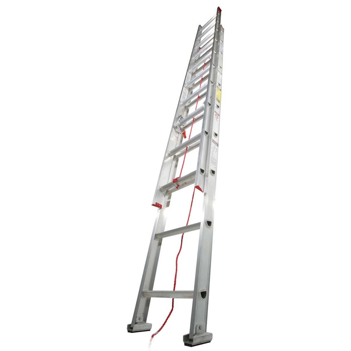 Lightweight aluminum extension ladder with a 200 lb duty rating. Features Exclusive Alflo rung joints for Twist-Proof stability, 1.5 in slip-resistant Traction-Tred D-rungs, spring-loaded rung locks, and pivoting shoes with slip-resistant pads. Includes mar-resistant end caps and a smooth pulley with polypropylene rope. Two-section design (2 x 12 rungs). Approximate product size: 144 in L x 16 in W x 5 in H; weight 30 lb. Max open extended height 21 ft 0.5 in; average reach height 23 ft.