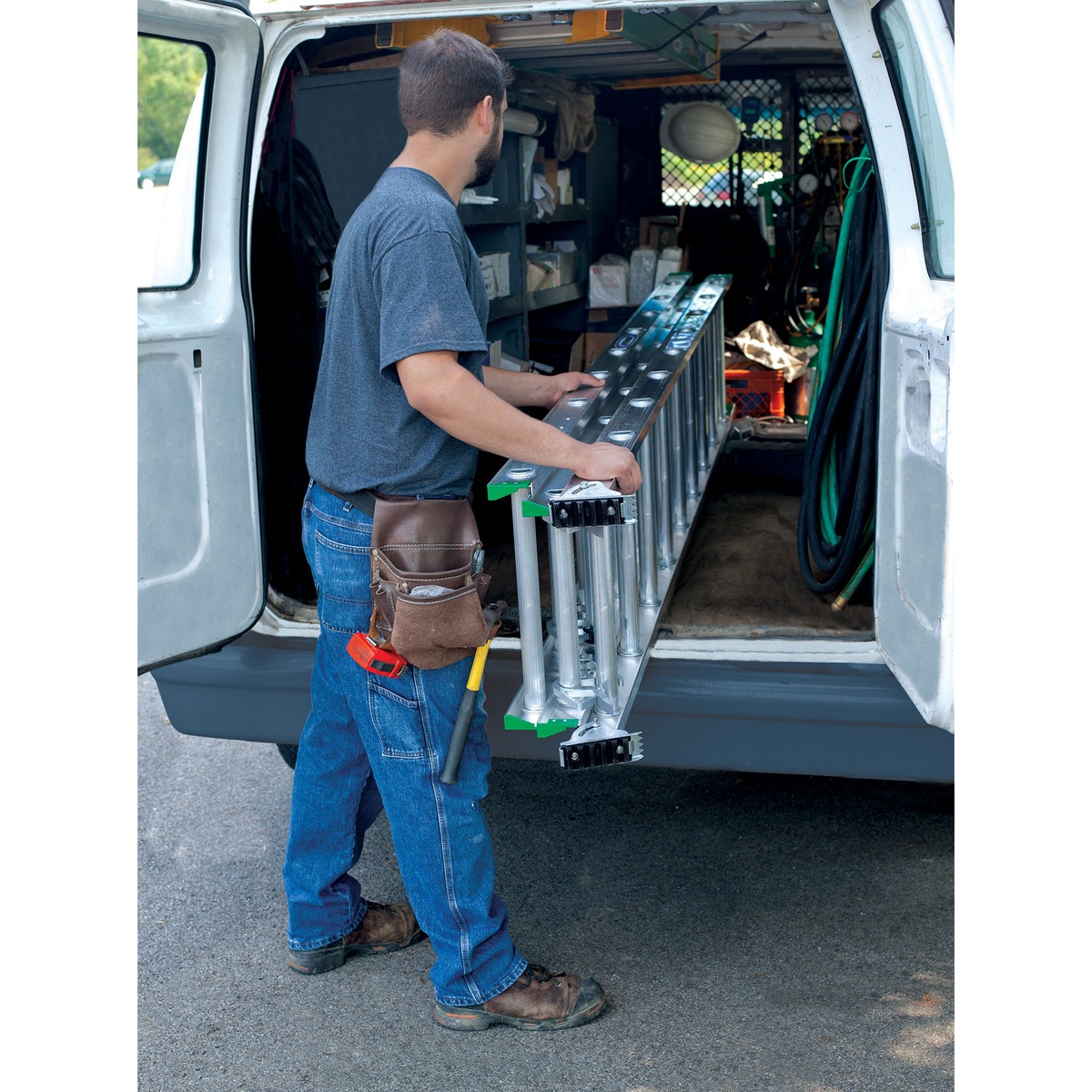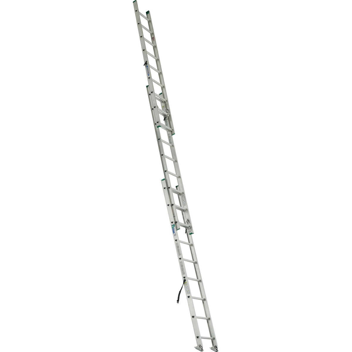 The D1224-3 is a compact, 3-section aluminum extension ladder with a 225 lb Type II duty rating. It features interlocking side rails and slip-resistant Traction?Tred D?rungs. Spring?loaded rung locks operate smoothly, while SHU?LOK shoes can rest flat on a slip?resistant pad or be set in spur position. Mar?resistant end caps protect contact surfaces, and the exclusive Alflo rung joint delivers Twist?Proof performance. Closed length is approximately 9 ft 6 in, providing the same usable length as a standard 2?section 24 ft ladder but in a more maneuverable form.