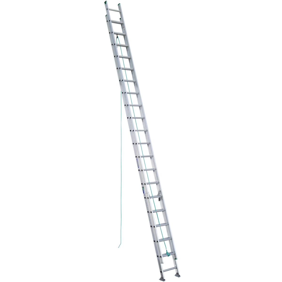 The D1240-2 aluminum extension ladder delivers a 225 lb Type II duty rating with interlocking side rails and slip-resistant Traction-Tred D-rungs. Exclusive Alflo rung joints provide Twist-Proof performance, while heavy-duty spring-loaded locks operate smoothly. The SHU-LOK shoe rests flat on a slip-resistant pad or locks into a spur position for traction, and mar-resistant end caps help protect contact surfaces. Includes smooth-operating pulley with polypropylene rope and heavy-duty modified I-beam side rails.