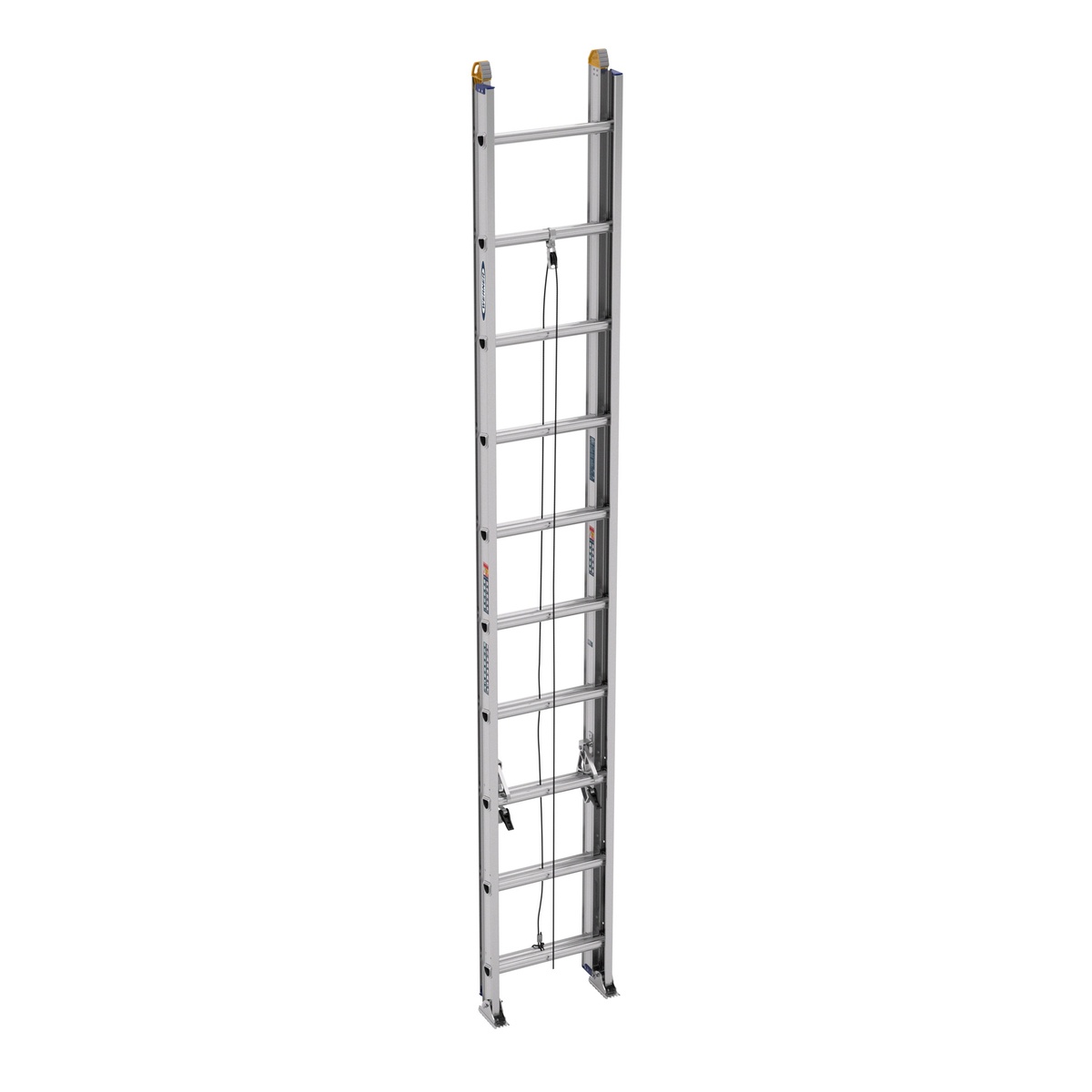 The D1320-2 features a 250 lb duty rating and heavy-duty modified I-beam side rails. Slip-resistant Traction-Tred D-rungs and interlocking side rails enhance stability, while spring-loaded rung locks operate smoothly. SHU-LOK shoes can rest flat on a slip-resistant pad or be set to a spur position. Mar-resistant end caps help protect contact surfaces, and Werner?s exclusive Alflo rung joint delivers Twist-Proof performance. 2 sections, 10 rungs per section; approx. product length 120 in, width 17.4 in, height 5.4 in; weight 32.5 lb.
