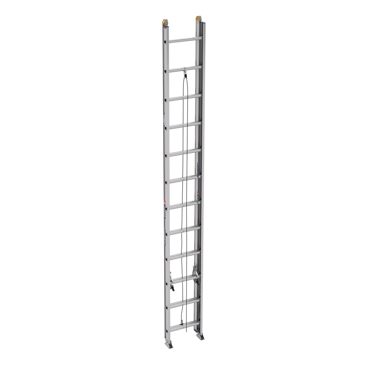 The D1324-2 aluminum extension ladder features a 250 lb Type I duty rating with heavy-duty modified I-beam side rails and interlocking rails. Slip-resistant Traction-Tred D-rungs, smooth-operating spring-loaded rung locks, and a pulley with polypropylene rope enhance safety and ease of use. SHU-LOK shoes provide secure footing flat or in spur position, while mar-resistant end caps protect contact surfaces. Exclusive Alflo rung joints deliver Twist-Proof performance.