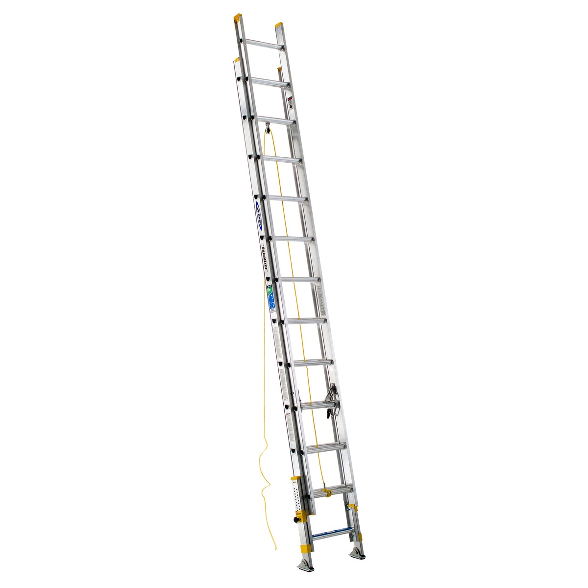 The Equalizer D1724-2EQ features a factory-installed EverLevel leveling system to eliminate uneven ground. It adjusts precisely in 3/8 in increments up to 8.25 in. Dual-action feet provide secure footing on hard or penetrable surfaces, while 1.75 in slip-resistant Traction-Tred D?rungs and exclusive Alflo rung joints deliver Twist?Proof performance. Heavy-duty modified I?beam rails, durable spring-loaded rung locks, and mar-resistant end caps add reliability. Approx. product: length 144 in, width 20.75 in, height 5.625 in; weight 39 lb. 2 sections (2 x 12); max open extended height 20 ft 9.75 in; average reach height 23 ft.