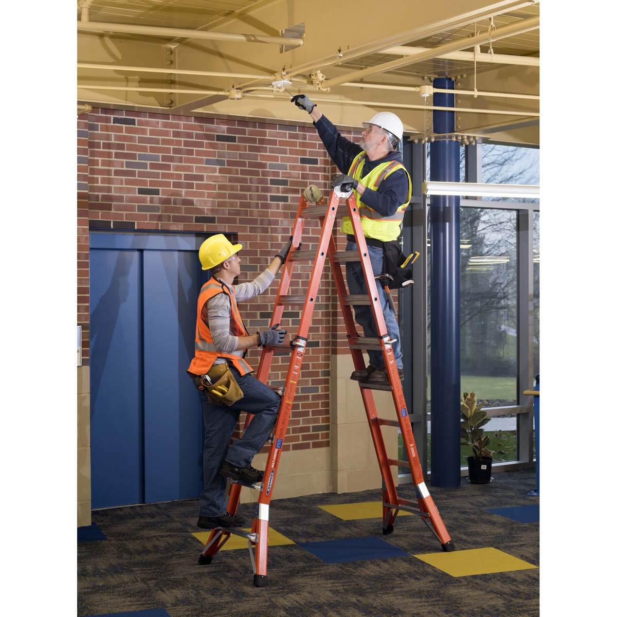 The FMT-22 is a professional-grade ladder designed to work around electricity and adapt to multiple jobsite needs. Its telescoping design quickly converts into five positions: Twin Step Ladder, Stairway Step Ladder, Extension Ladder, Wall Ladder, and two Scaffold Bases. In step-ladder mode, it supports one or two users with a 300 lb duty rating per side. Non-conductive fiberglass rails, slip-resistant feet, flared ends, wide rungs, and smooth curved rails enhance stability and comfort. Impact-resistant hand grips and shatter?proof J?Locks add durability while compact storage makes transport easy.
