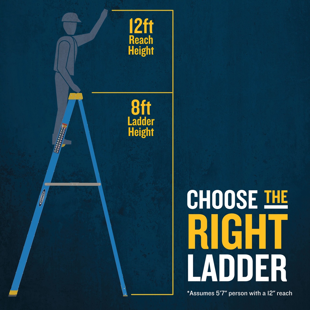 - Ladder height: 8 ft; Max safe reach: 12 ft 3 in (assumes 5’7″ user with 12″ reach)