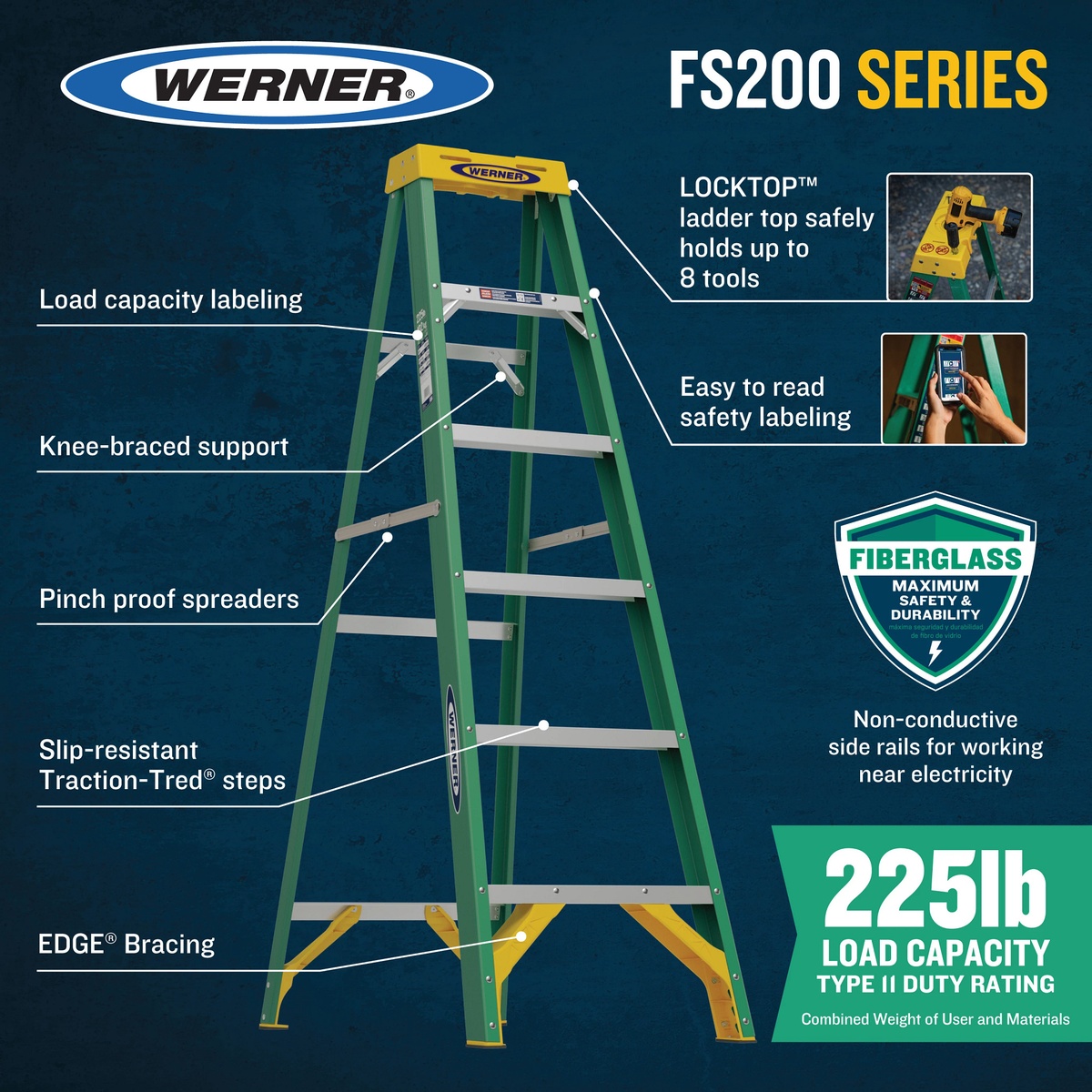 Werner FS208 8ft Type II Fiberglass Step Ladder, 225 lb Load, 12 ft 3 in Max Safe Reach