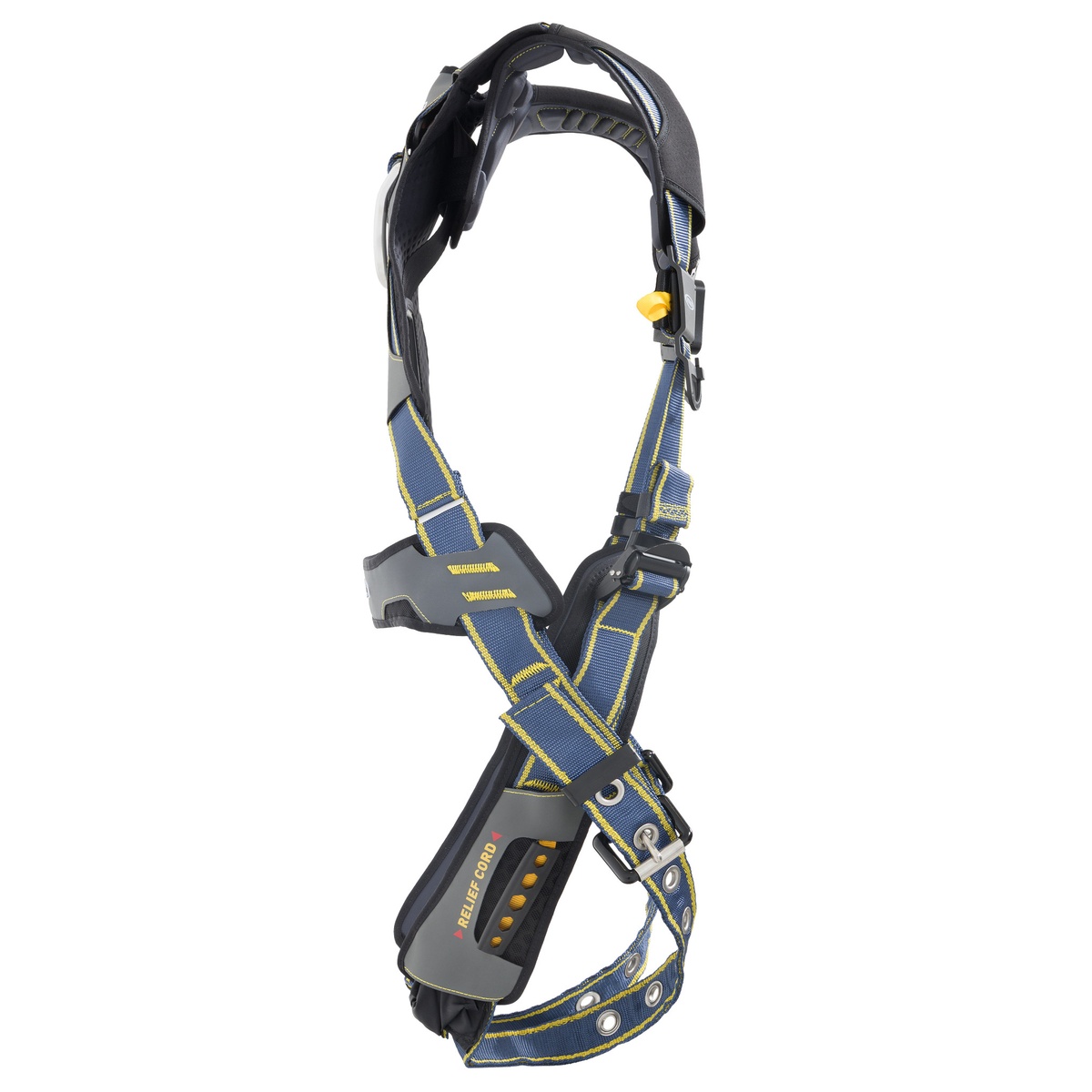 The Werner ProForm F3 H012001 Standard Harness delivers comfort and safety with lightweight materials and athletic styling. Relief Cords deploy a built-in seat to help achieve the Gravity Override position after a fall, while the dual back pad can be repositioned to reduce clavicle pressure. WebAlert2 inspectable webbing adds a weather?resistant coating. Fit and usability features include cam torso adjustment, aluminum quick?connect chest buckle with engagement indicator, tongue?buckle leg straps, lanyard keeper, and roll?down torso web keepers. An integrated SRL bumper helps protect the lower back when wearing personal SRLs. Certified to ANSI Z359.11?2021 and compliant with OSHA 29 CFR 1910.140 and 1926.502. Size: Small. Color: Black/Blue. Style: Standard with Back D?Ring.