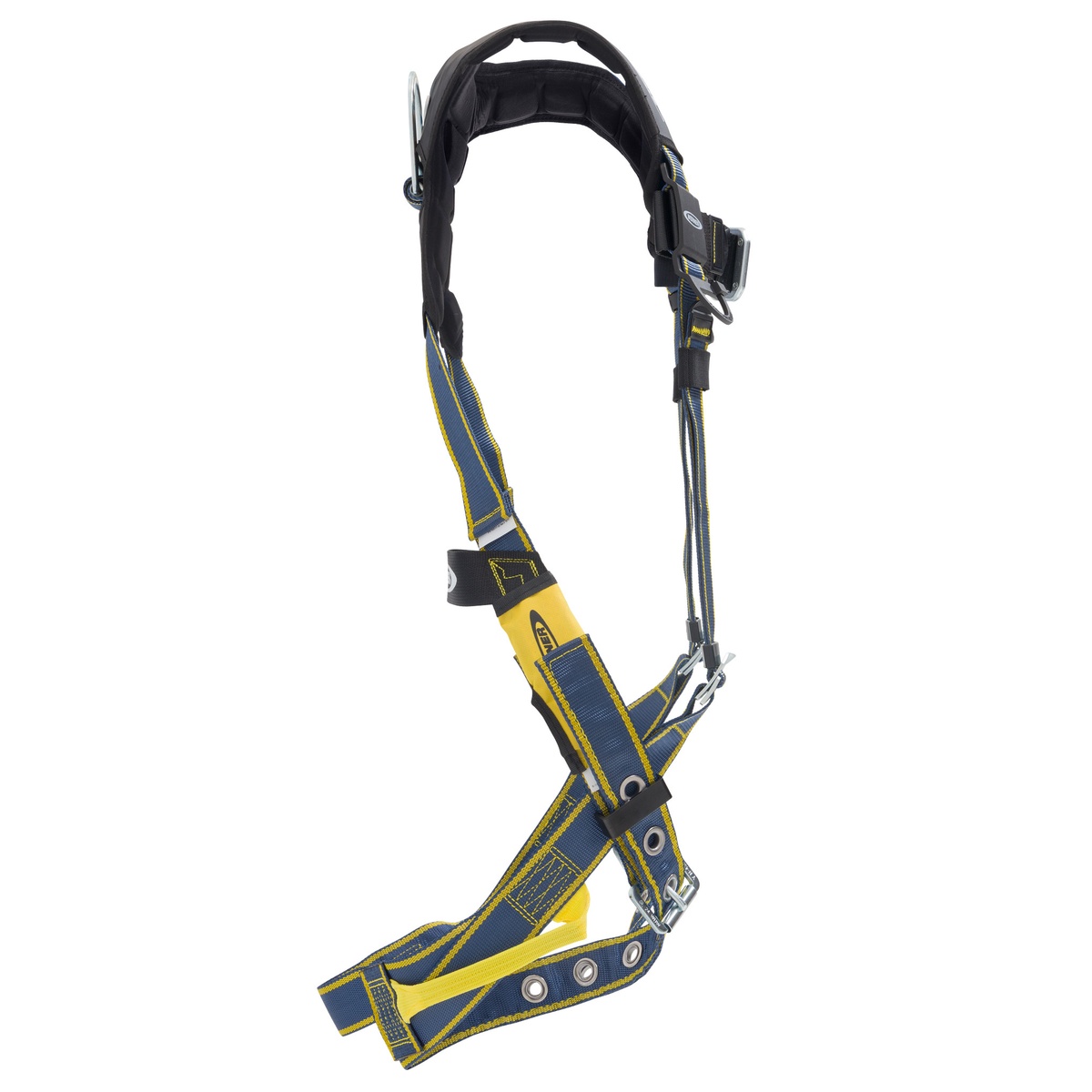 Blue Armor H112002 Standard Full Body Harness with Back D-Ring includes Relief Handles for gravity override positioning to help reduce suspension trauma risk. WebAlert inspectable webbing and multiple impact indicators make inspection easier. Lightweight, form-fitting padding with breathable interior enhances comfort and resists tangling. Quick-Connect chest buckle and tongue-buckle leg straps enable fast donning and are ideal for shared use. Five-point adjustability ensures a proper fit. Rear dorsal D-ring is forged alloy steel for durability. Certified to ANSI Z359.11-2021 and OSHA 29 CFR 1910.140 & 1926.502.
