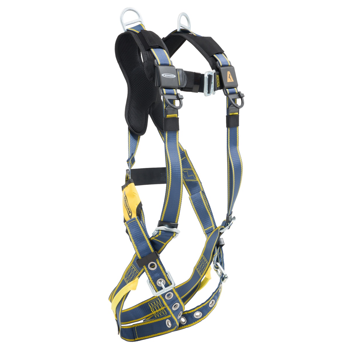The H142004 full-body harness features shoulder and rear dorsal D-rings for confined space retrieval and fall arrest. Relief Handles help users reach the gravity override seated position to reduce suspension trauma. WebAlert inspectable webbing and impact indicators simplify inspections. Lightweight, breathable padding enhances comfort, with Quick Connect chest buckle and Tongue buckle leg straps ideal for shared use. Five-point adjustments provide an optimal fit and bright colors improve visibility on the jobsite. Meets ANSI Z359.11 standards.