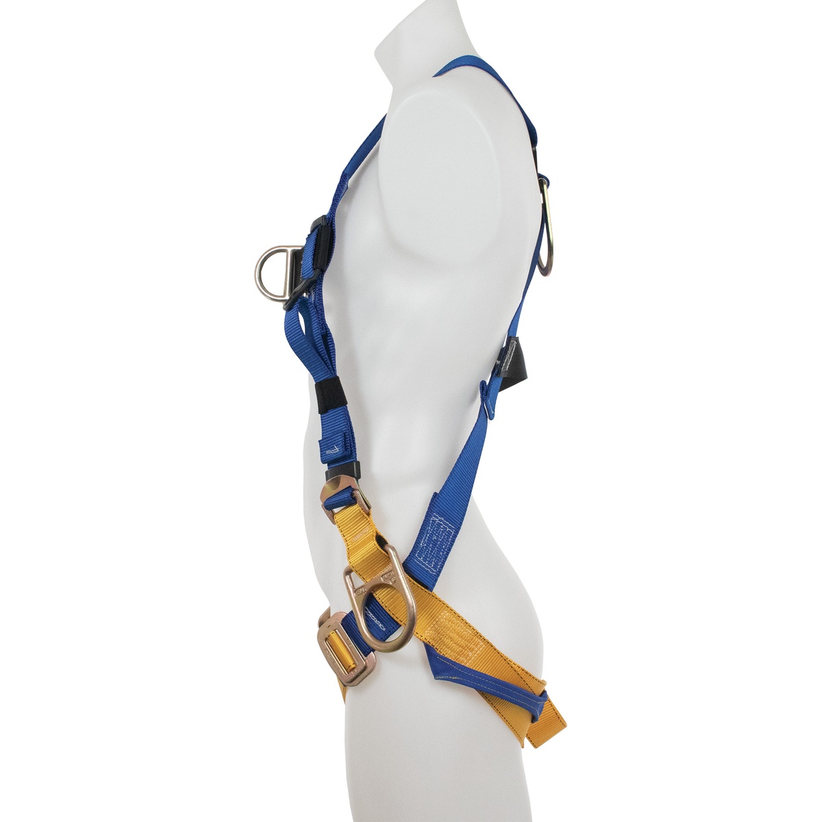 The LITEFIT H361002 provides the right fit and value for climbing and positioning applications. Pull the patented Relief Handles after a fall arrest to reach a gravity override seated position, reducing suspension trauma risk. The harness includes 5-point adjustments, lightweight hardware, and high-visibility blue/yellow webbing. A high-strength alloy steel rear dorsal D-ring with adjustable pad enhances comfort. Hip D-rings support positioning tasks, and a chest D-ring serves climbing needs. Slotted pass-through buckles on leg and chest straps fasten securely without twisting.