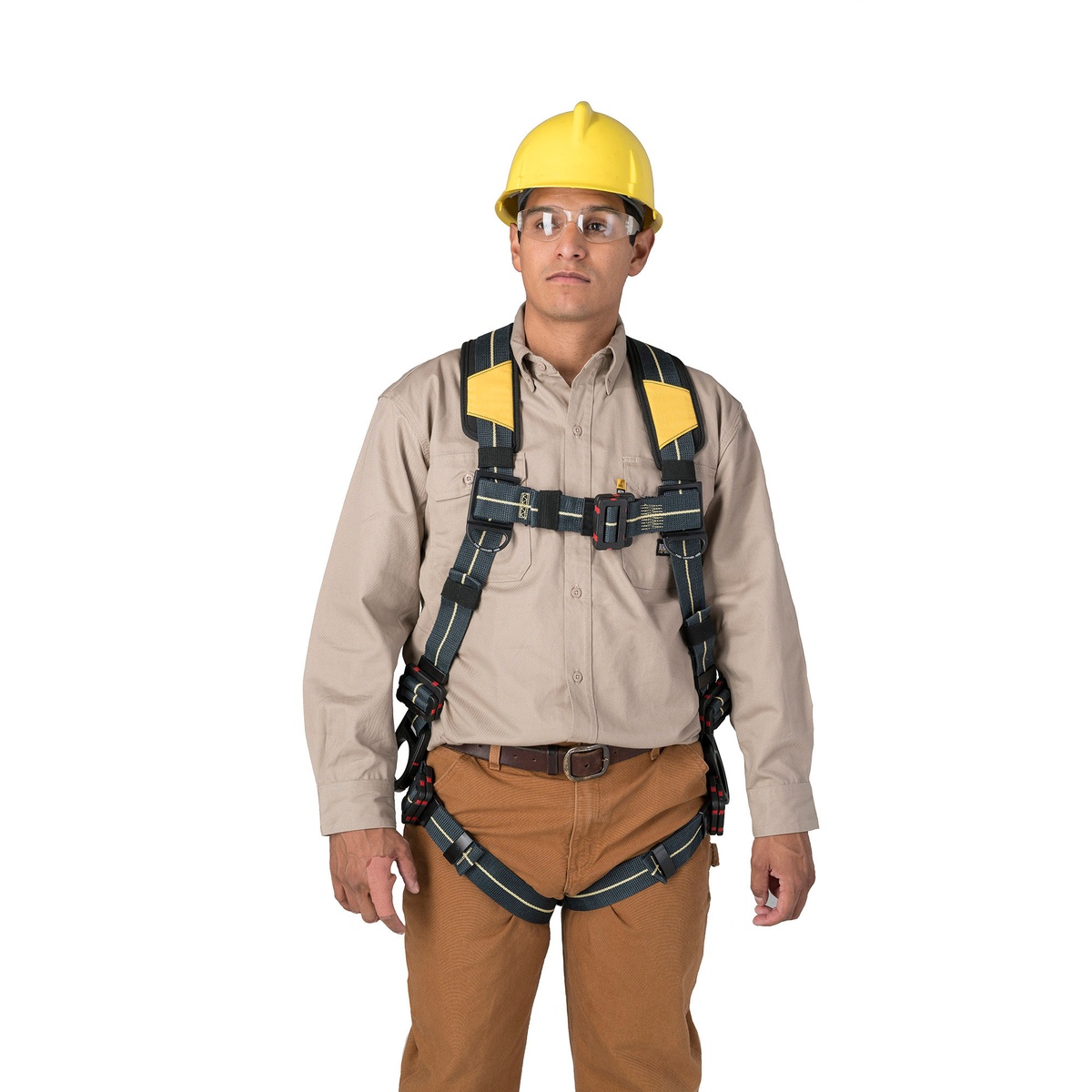 The Werner Arc Flash H914004 full body harness is designed for work environments with potential electric arc exposure. Constructed with Kevlar webbing and dielectric hardware, this XL-size harness meets ASTM F887 Arc Flash requirements and ANSI Z359.11 as well as OSHA 1926 & 1910 fall protection standards. It features a Standard configuration with a back D-ring, dielectric pass-thru chest and leg buckles, shoulder and back padding for all?day comfort, lanyard keeper, and fall indicators. Built-in yellow seat handles aid in achieving the gravity override position to reduce suspension trauma risk.