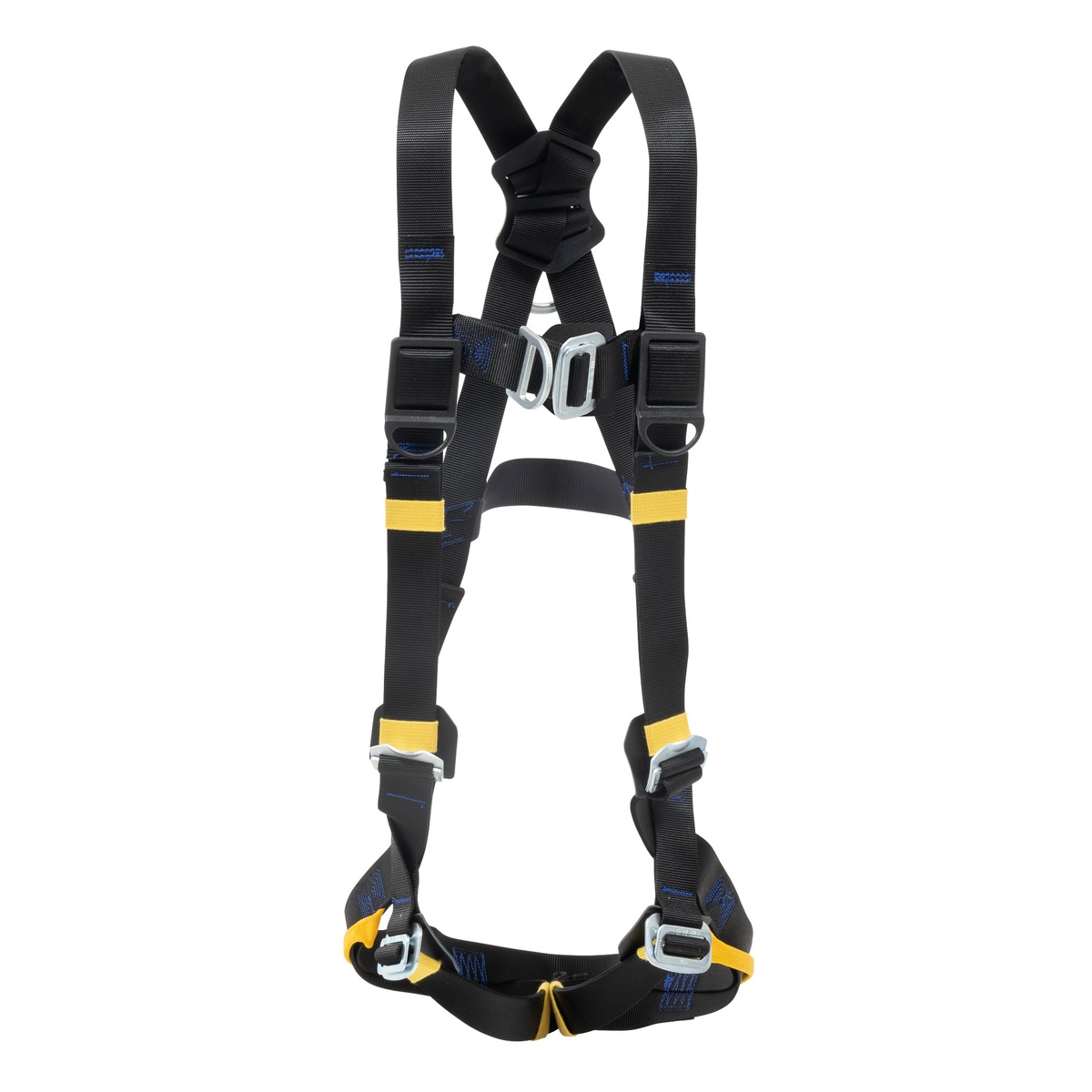 Designed for applications with potential electric arc exposure. High Performance Nylon webbing and steel hardware with leather insulators meet ASTM F887 arc flash requirements, as well as ANSI Z359.11 and OSHA 1926 & 1910 fall protection standards. Built-in yellow seat handles help users achieve a gravity override seated position to reduce suspension trauma. Includes back and front D-rings and pass thru leg connections for secure fit.