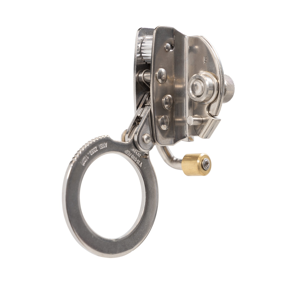 The L240000 is a manual trailing rope grab that travels up and down vertical lifelines to provide continuous fall protection. Its design lets the user attach or remove the unit anywhere along the lifeline and secure it in a fixed position for restraint or positioning applications. Constructed of stainless steel and designed for use with 5/8 in rope lifelines, the rope grab offers a 3,600 lb minimum breaking strength and features a 2.16 in ring diameter.