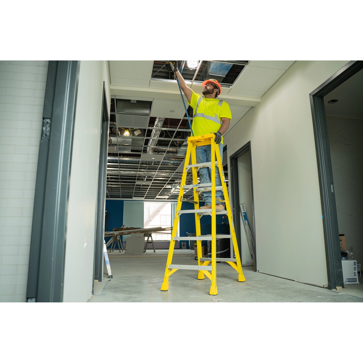The Werner M400003 Tool Tether provides a secure connection point for hand tools to help protect workers and property from dropped objects. The stretch-cord lanyard is encased in durable webbing, measuring 30 inches retracted and extending to 50 inches. It features a carabiner on one end and a drawstring loop on the other for attachment to a work belt or harness. Rated for a maximum working load of 15 pounds.