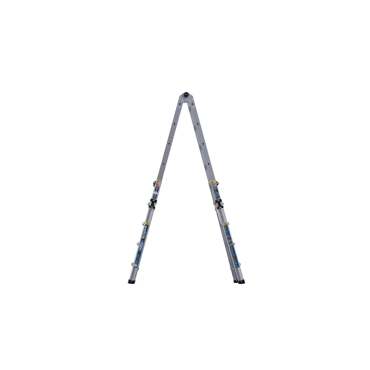 The MT-22IAA meets the needs of pros with a 375 lb duty rating and a lightweight POWERLITE rail system. It offers 32 adjustable positions and functions as five ladders in one: extension ladder, double-sided twin step ladder, stairway ladder, 90? wall ladder, and two self-supported scaffolding bases. Redesigned shatterproof J-locks and oversized push knobs enhance durability and ease of use, while a wide flared base and slip-resistant feet provide firm support. Size aligns with ANSI length definitions.