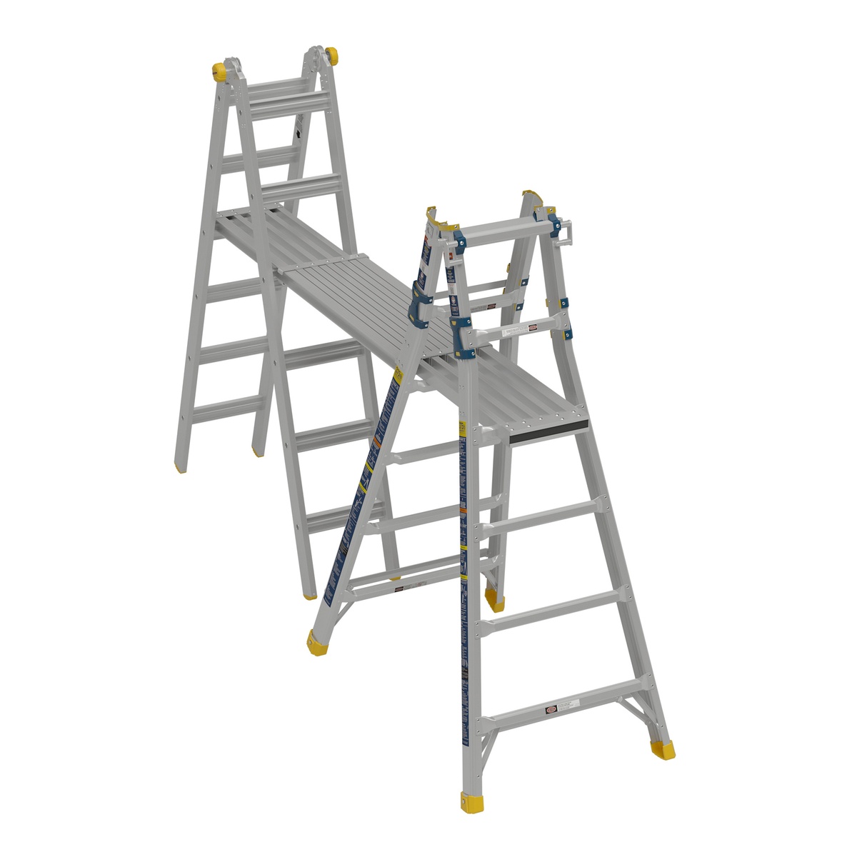 • Adjustable telescoping design with 5 positions: twin step, stairway step, extension, wall, and 2 scaffold bases
