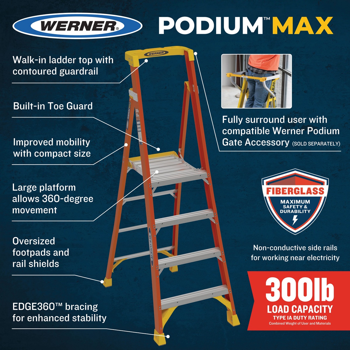 Werner PD6202 8ft Reach Fiberglass Podium Ladder, 2ft Platform, Type IA 300 lb