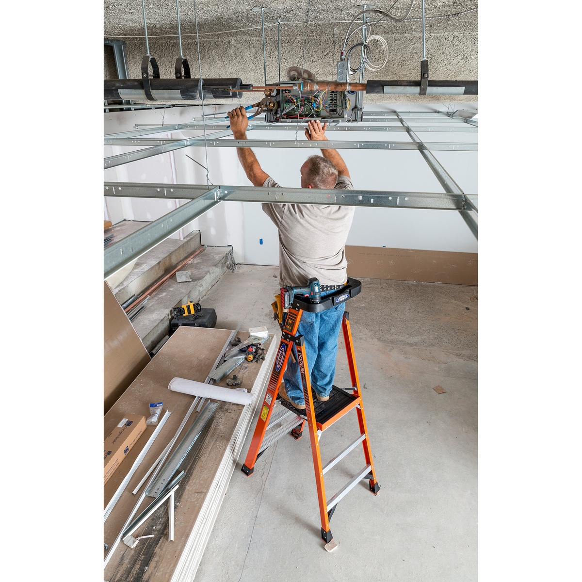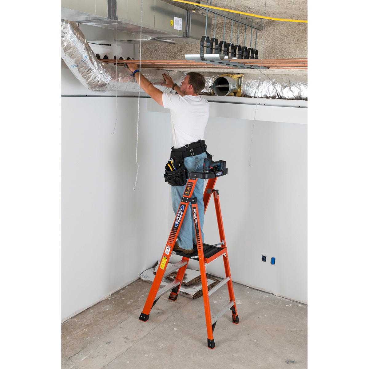 • 3 ft fiberglass podium ladder with 9 ft average reach height