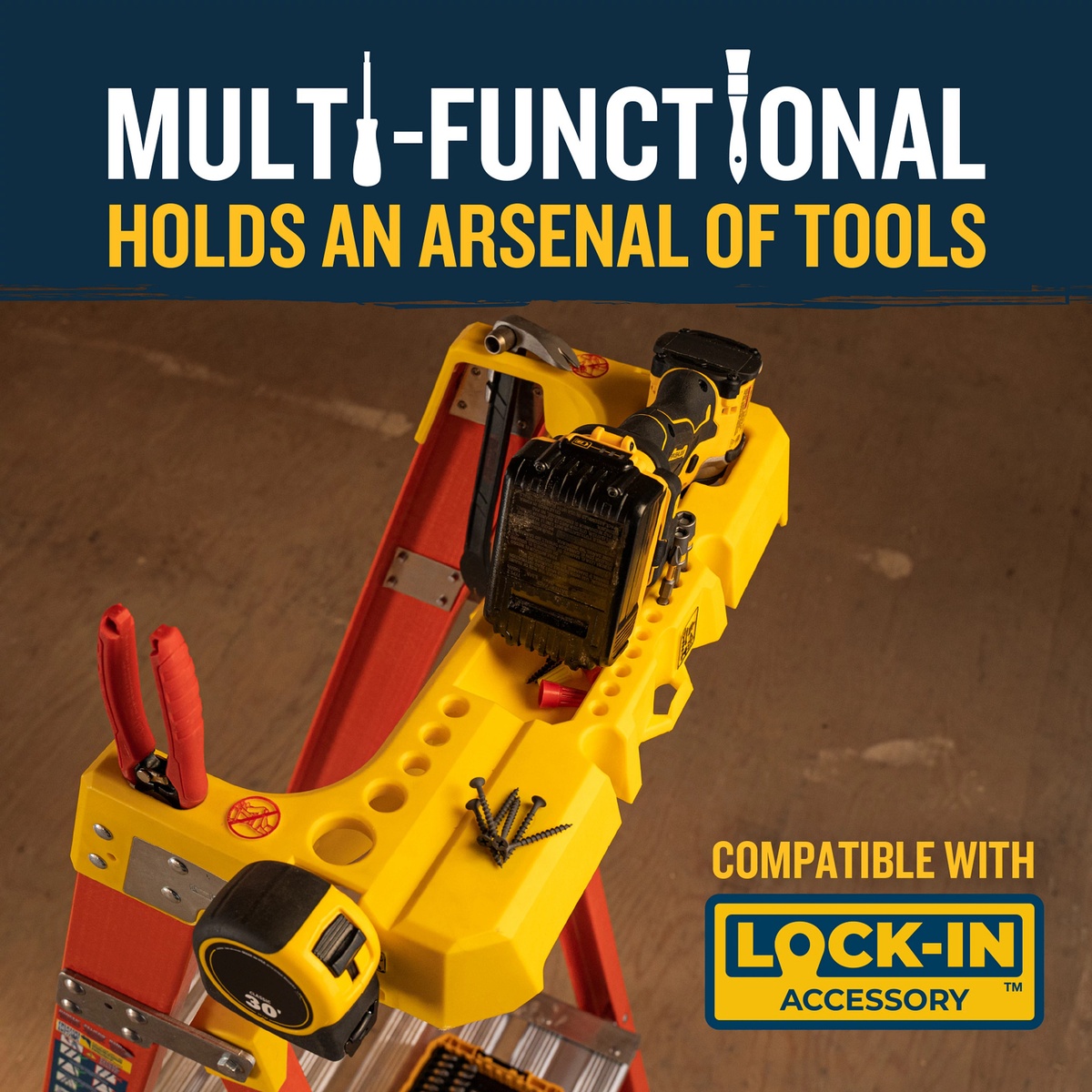 The PDLIA02 Podium+ Ladder offers the same reach height as a 4-foot stepladder and is ideal for long-duration work at fixed heights. A large 15 in x 18.5 in platform reduces fatigue and allows you to face any direction within a 4X Work Zone. The wraparound multi-function LOCKTOP guardrail holds tools and accepts lock-in accessories, with carabiner holes for tethering. Aluminum bracing on each step and full rear horizontals add durability, while EDGE360 provides drop protection with an integrated rail shield, bracing and oversized foot pads. Duty rating: Type IA, 300 lb.