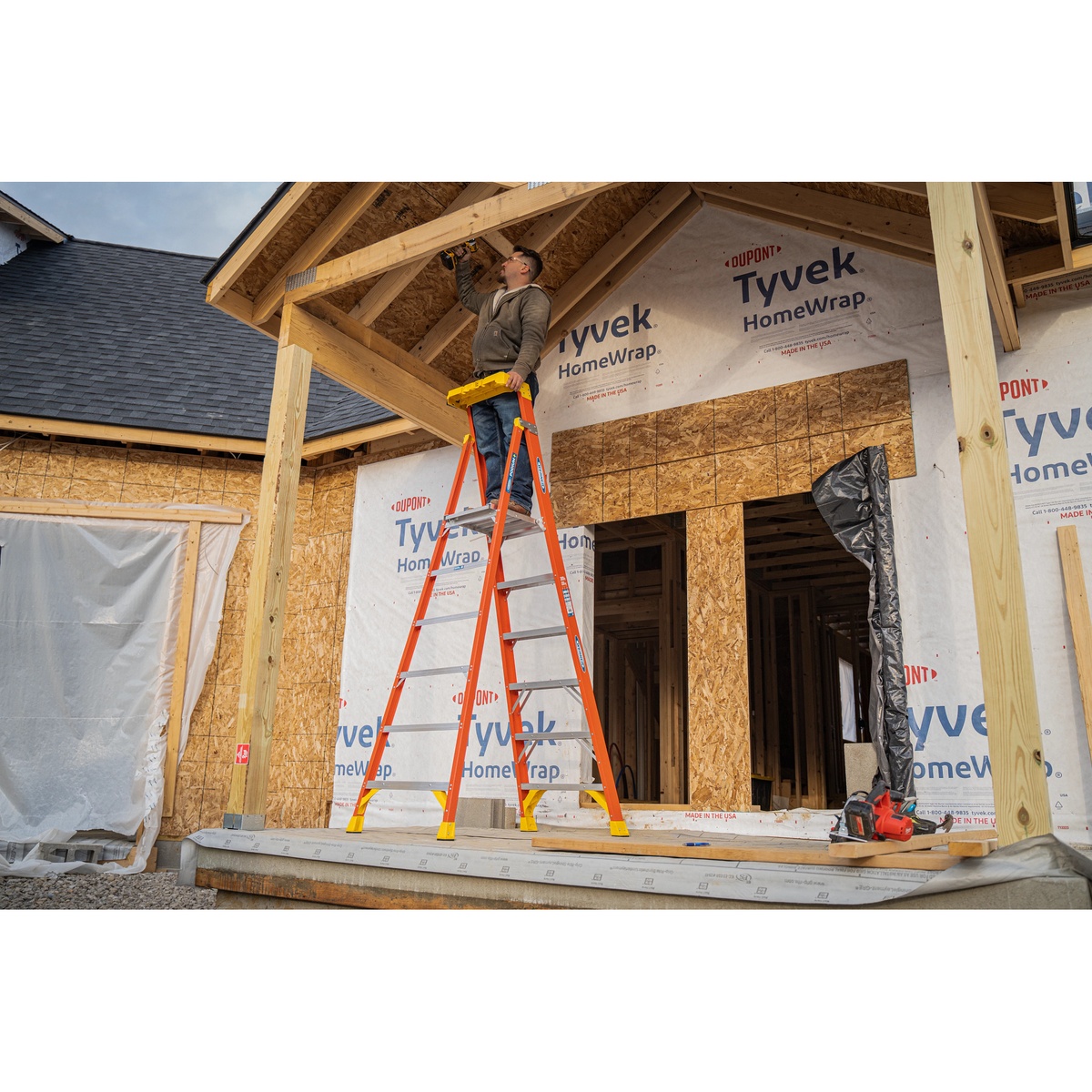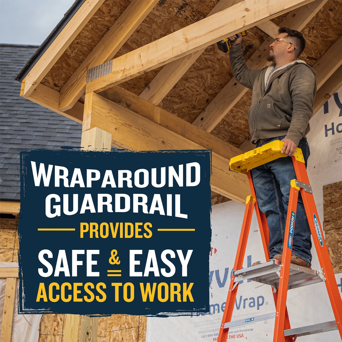 • 6 ft Podium+ fiberglass ladder with 12 ft reach height